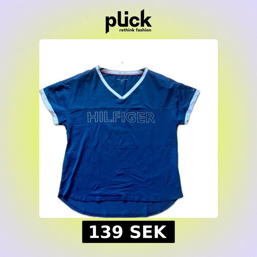 Blå t-shirt från Tommy Hilfiger med v-ringning och ljusblå detaljer vid hals och ärmslut. Stort HILFIGER-tryck framtill. Skön passform och tillverkad i mjuk bomull, perfekt för en avslappnad stil.