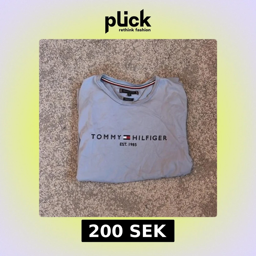 Säljer en ljusblå t-shirt från Tommy Hilfiger med tryck 'Est. 1985' på framsidan. T-shirten är kortärmad och har en klassisk rund halsringning. Perfekt för en avslappnad stil. Har ett litet hål på ryggen, annars är den nästan oanvänd.