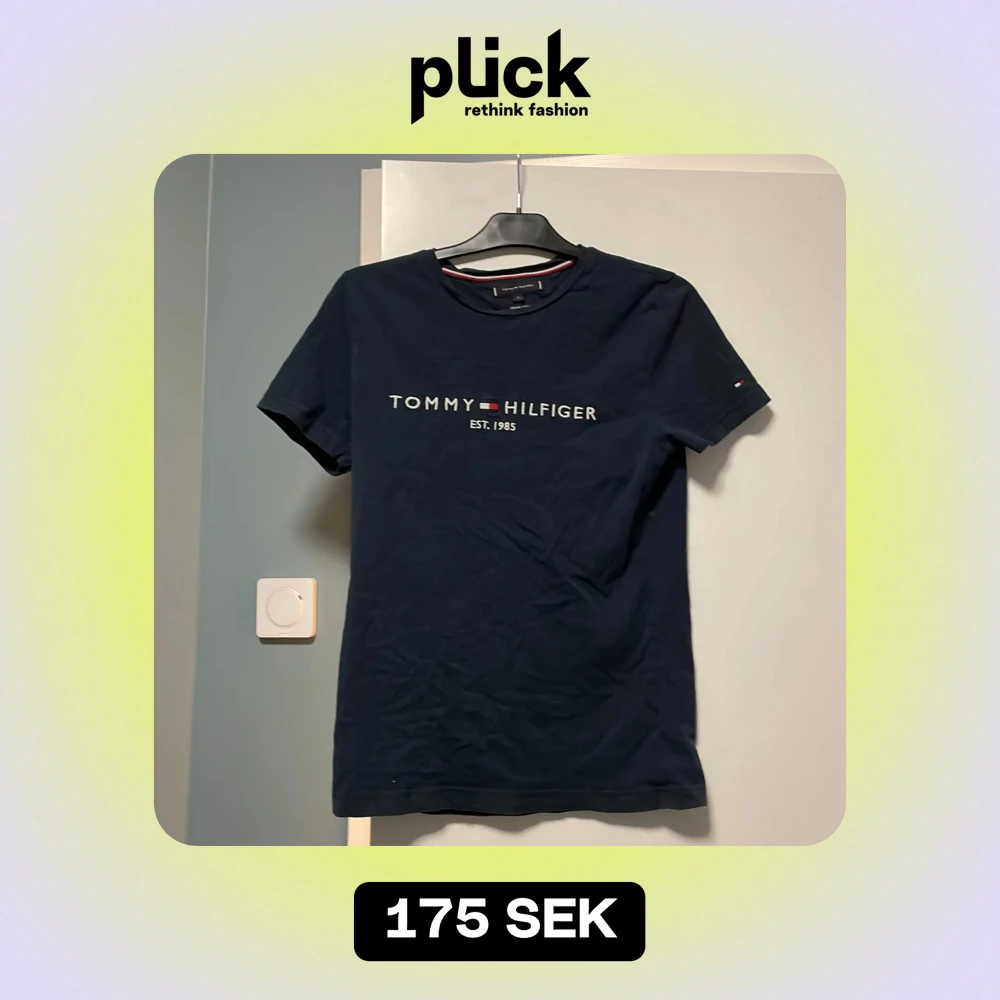 Säljer en snygg mörkblå t-shirt från Tommy Hilfiger i ekologisk bomull. Den har korta ärmar och ett stilrent tryck med märkesnamnet och 'Est. 1985' på framsidan. Perfekt för en casual look!