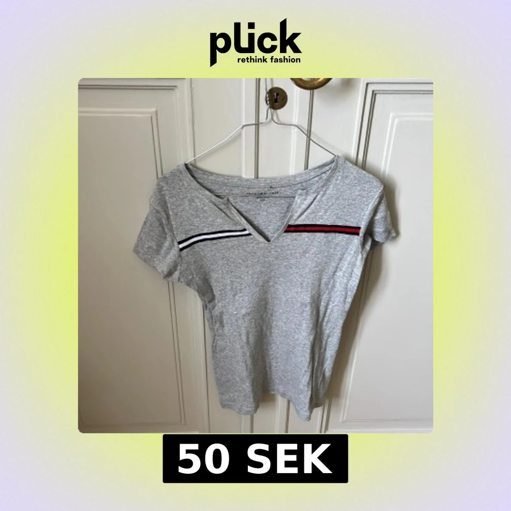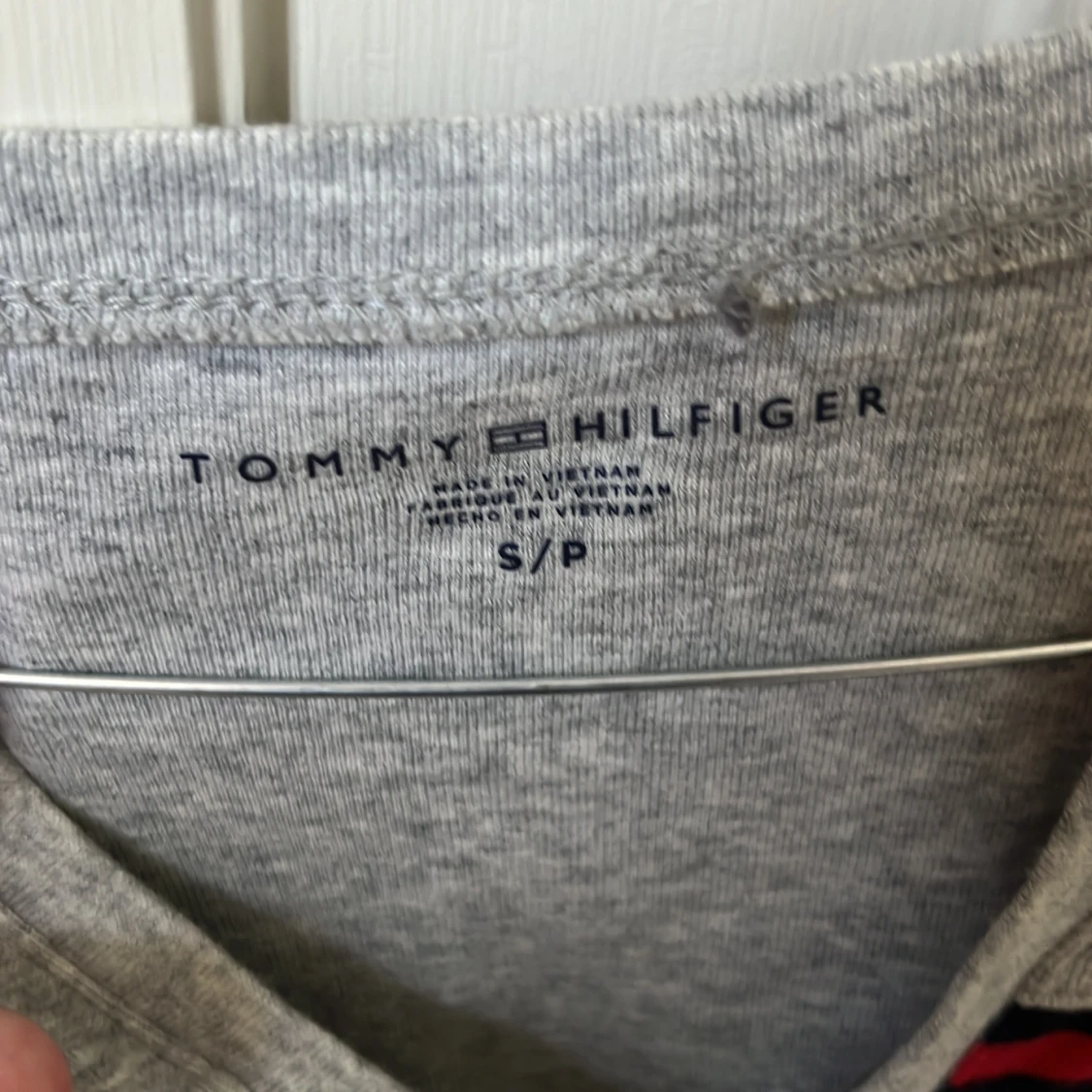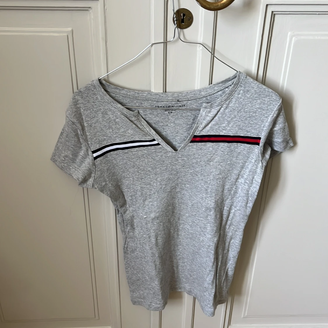 Snygg grå t-shirt från Tommy Hilfiger med korta ärmar och v-ringning. T-shirten har svarta, vita och röda ränder över bröstet som ger en sportig vibe. Tillverkad i mjuk bomull, perfekt för en chill och stilren look.