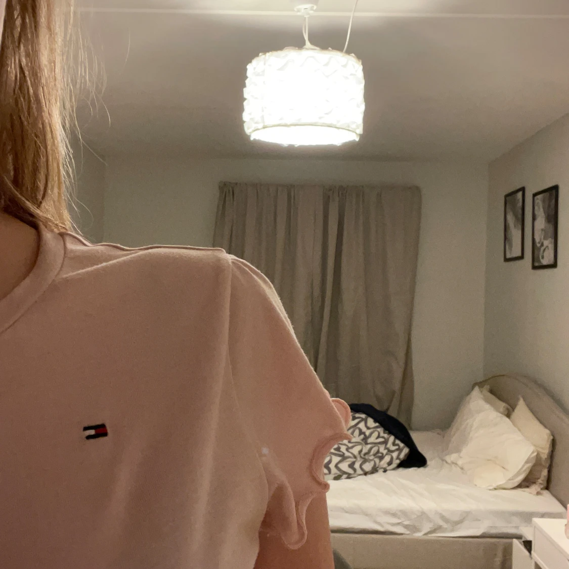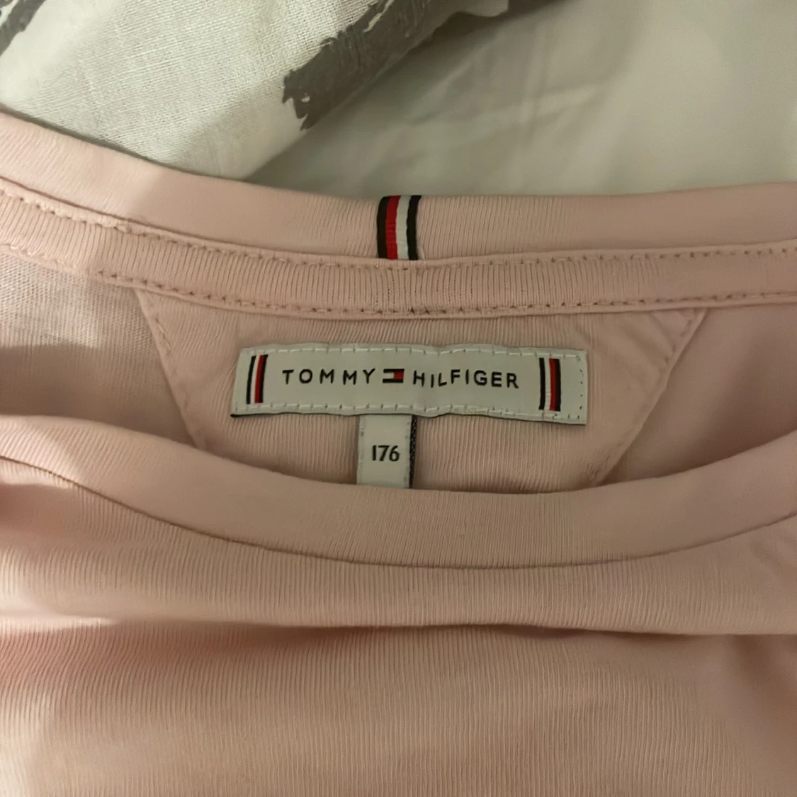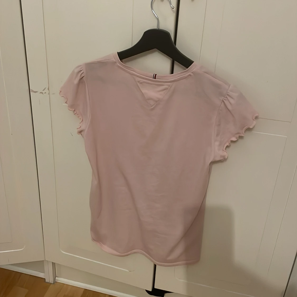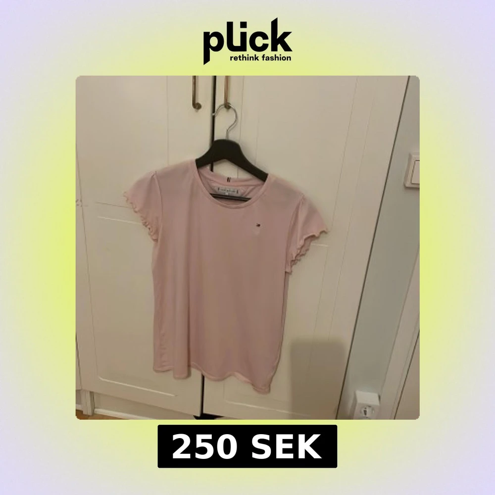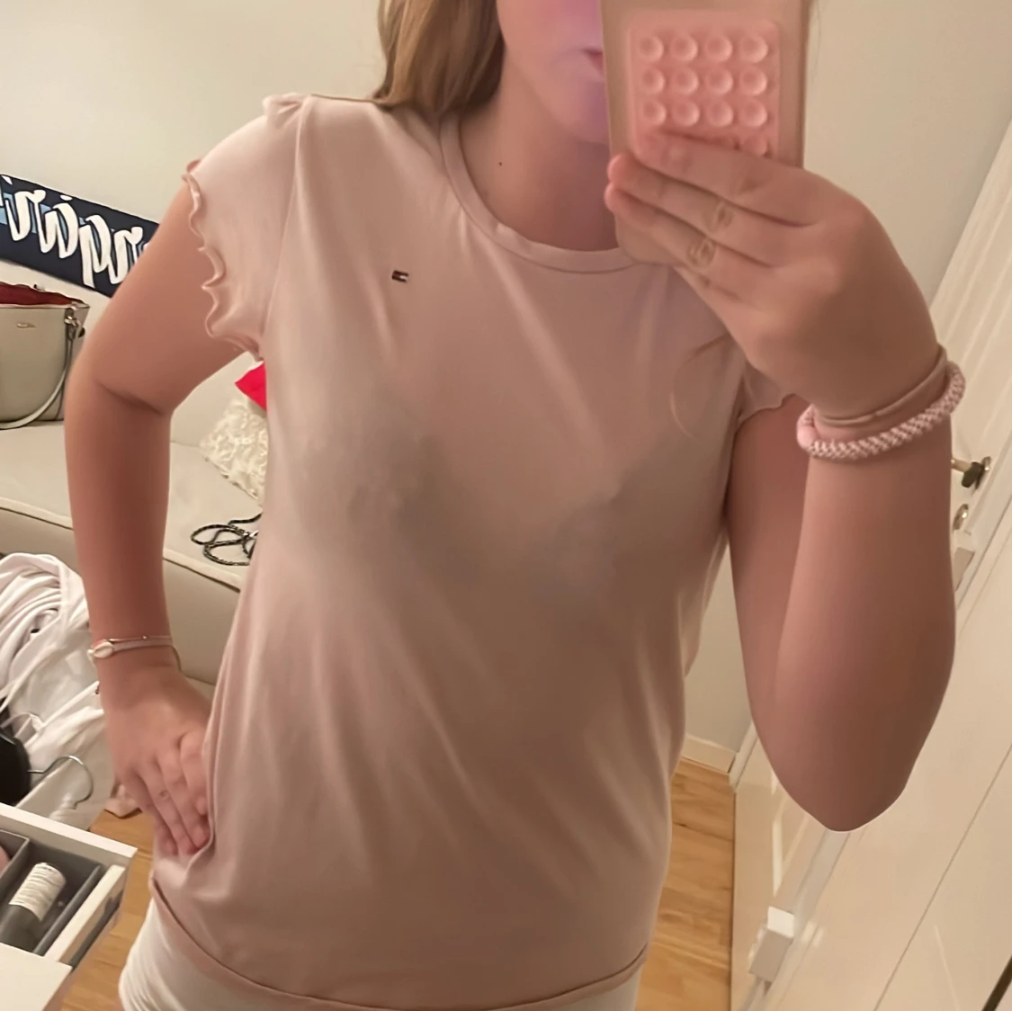 Säljer en söt rosa t-shirt från Tommy Hilfiger med volangdetaljer på ärmarna. Den har en liten logga på bröstet och är i en mjuk bomullskvalitet. Perfekt för en avslappnad stil. Fin rosa färg nu t våren/sommaren säljer pgv används nt så mycket, köpte för 400, st 176 men passar S o M