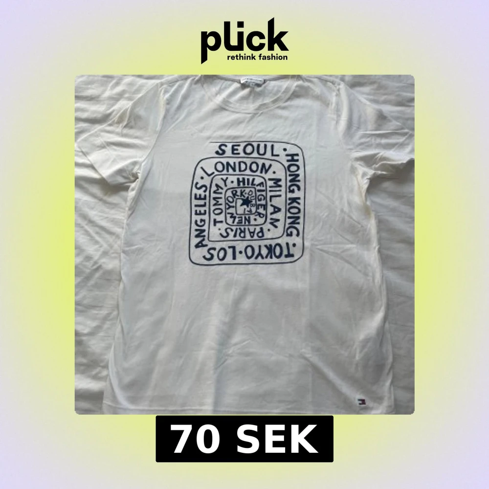 Vit t-shirt från Tommy Hilfiger med coolt city-tryck i marinblått på bröstet. Klassisk passform, rund hals och korta ärmar. Liten Tommy Hilfiger-logga nertill. Perfekt för dig som gillar streetstyle och snygga prints.