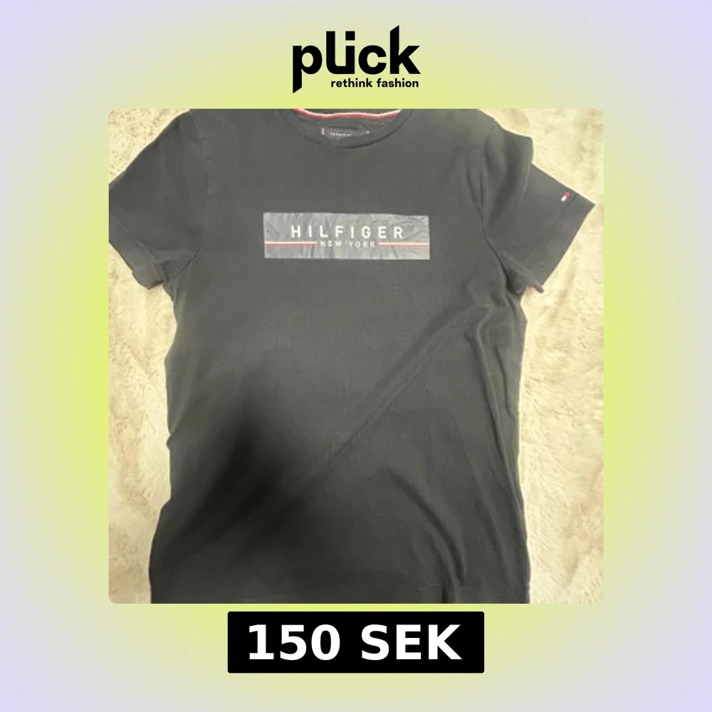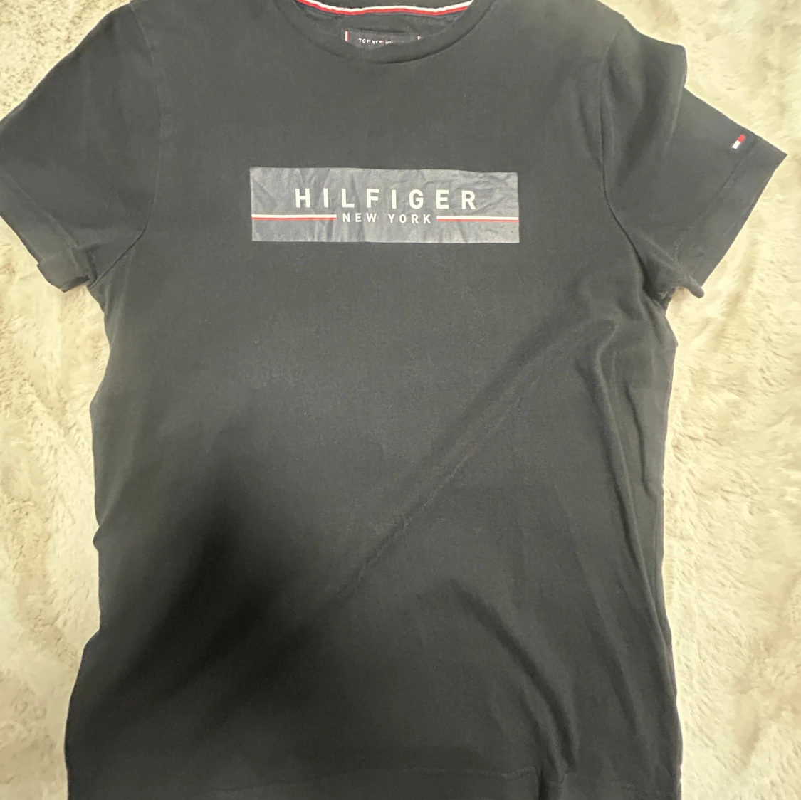 Svart t-shirt från Tommy Hilfiger med tryckt logga 'Hilfiger New York' på bröstet. Klassisk rund halsringning och korta ärmar. Skön passform och diskret liten flagga på ärmen. Perfekt för en stilren och enkel look.