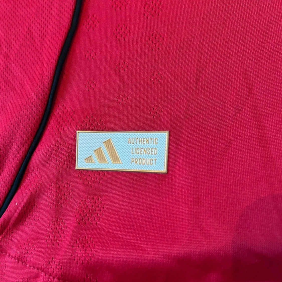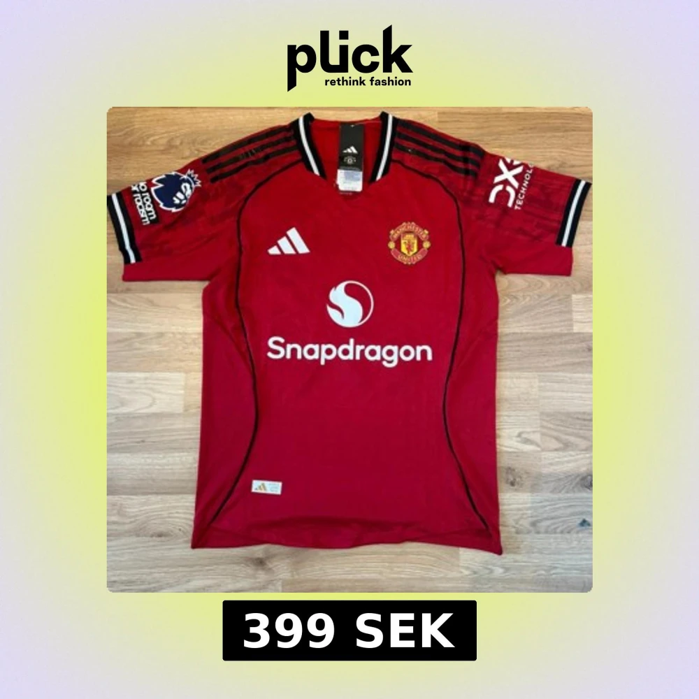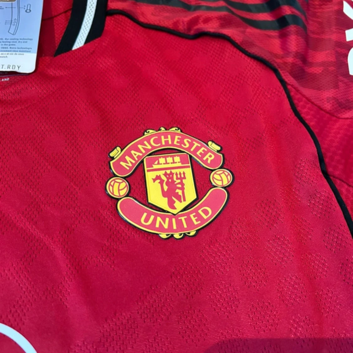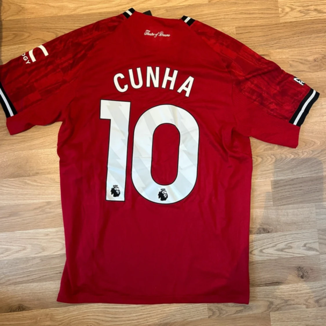 Röd Manchester United fotbollströja från Adidas med tryck 'Cunha 10' på ryggen. Tröjan har korta ärmar, svarta och vita detaljer på axlar och ärmslut samt klubbmärke och sponsorer på bröstet. Tillverkad i lätt och ventilerande funktionsmaterial.