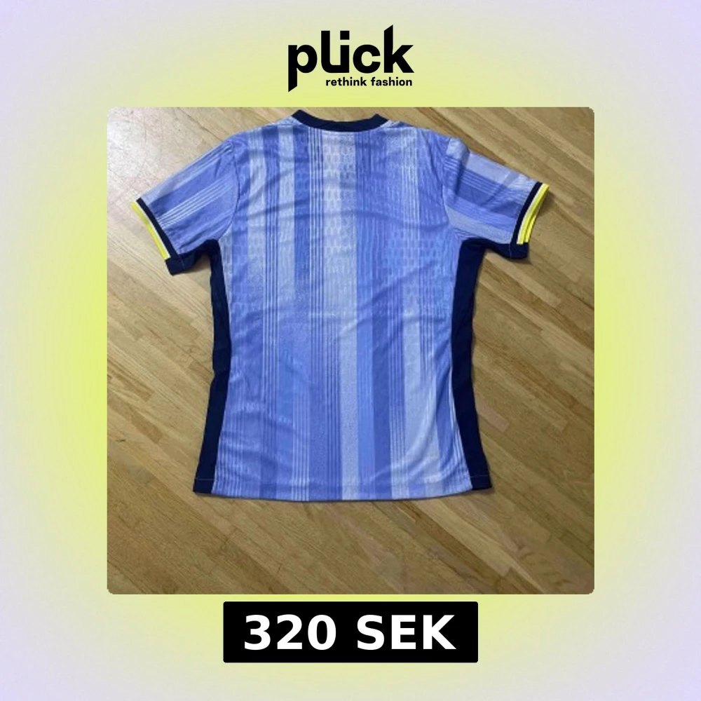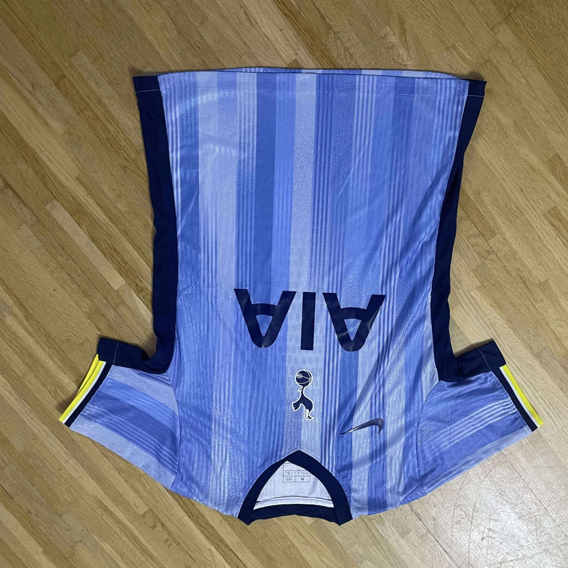 Säljer en Tottenham Hotspur bortatröja från Nike i blått med randigt mönster. Tröjan har mörkblå detaljer på sidorna och kragen, samt gula inslag vid ärmsluten. Materialet är lätt och andas, perfekt för fotbollsträning eller match.