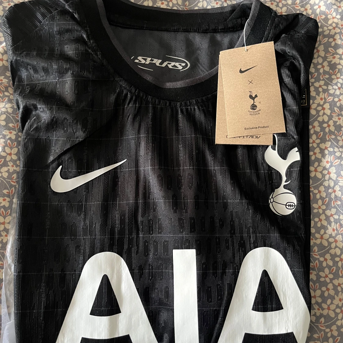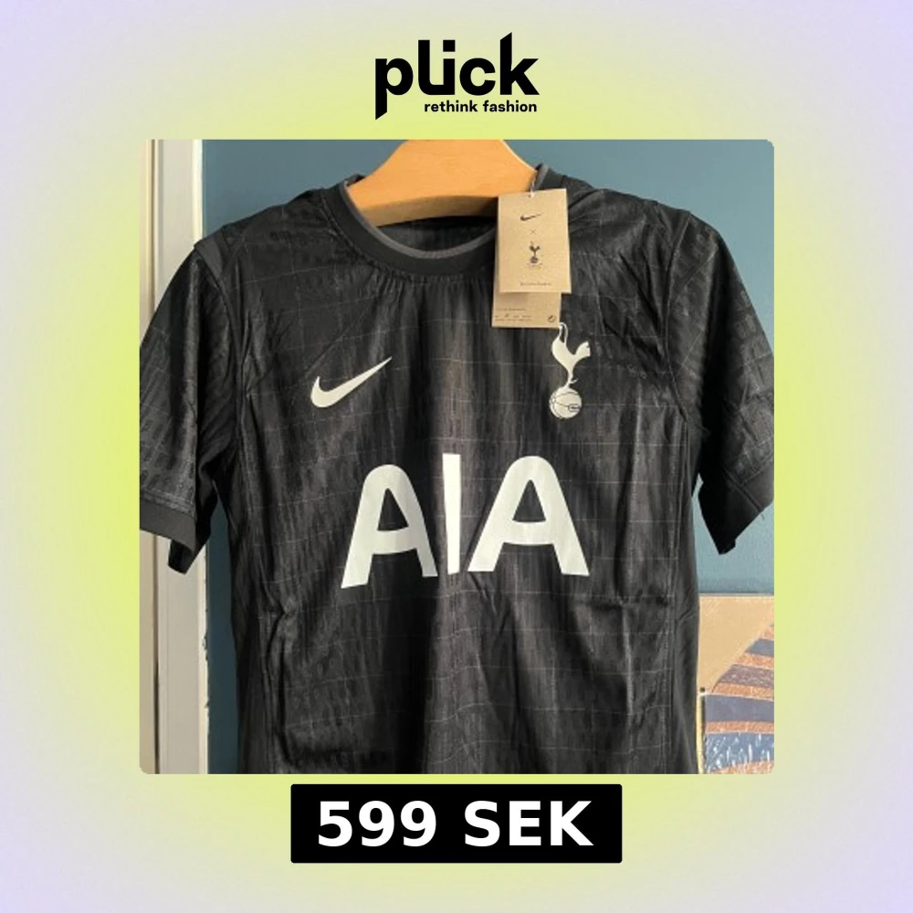 Snygg svart Tottenham Hotspur fotbollströja från Nike med diskret rutmönster och klubbens emblem på bröstet. Tröjan har korta ärmar, rund hals och är tillverkad i ett lätt, ventilerande material. Stor AIA-logga framtill i vitt.
