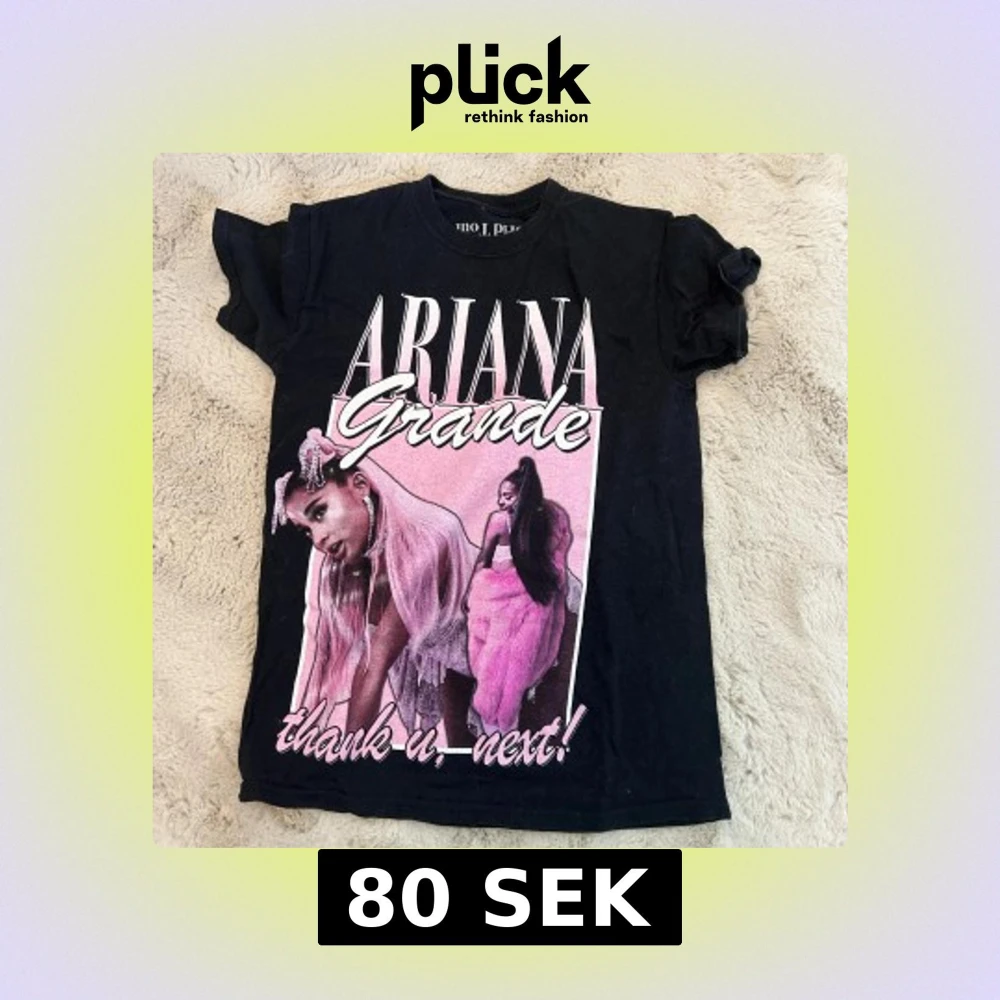 Svart t-shirt med stort tryck av Ariana Grande och texten 'thank u, next!' på framsidan. Baksidan har turnétryck med städer och 'Sweetener World Tour 2019' i rosa och vitt. Klassisk passform och rund hals.🩷 Köparen står för frakt och priset går alltid att diskutera🩷