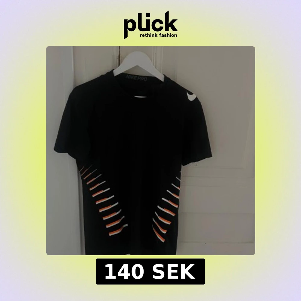 Svart t-shirt från Nike Pro med coolt grafiskt tryck i vitt och orange längs sidorna. Klassisk rund hals och korta ärmar. Perfekt för dig som gillar sportig stil och vill sticka ut lite extra. Snygg Nike-logga på axeln.