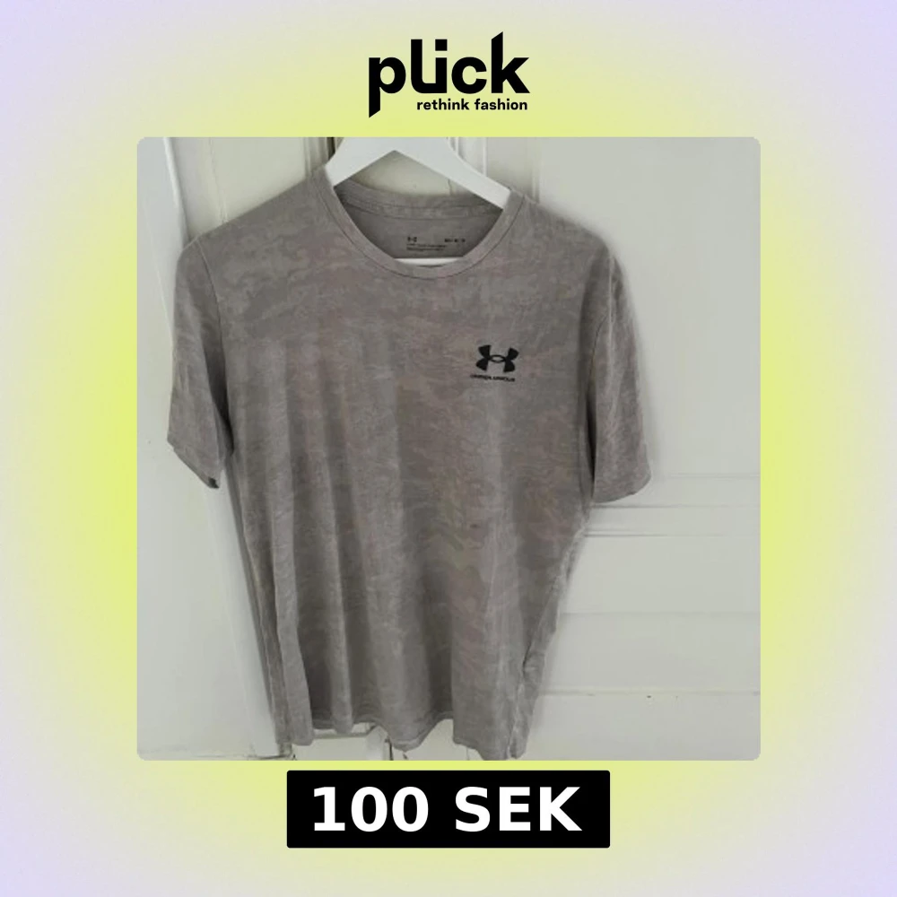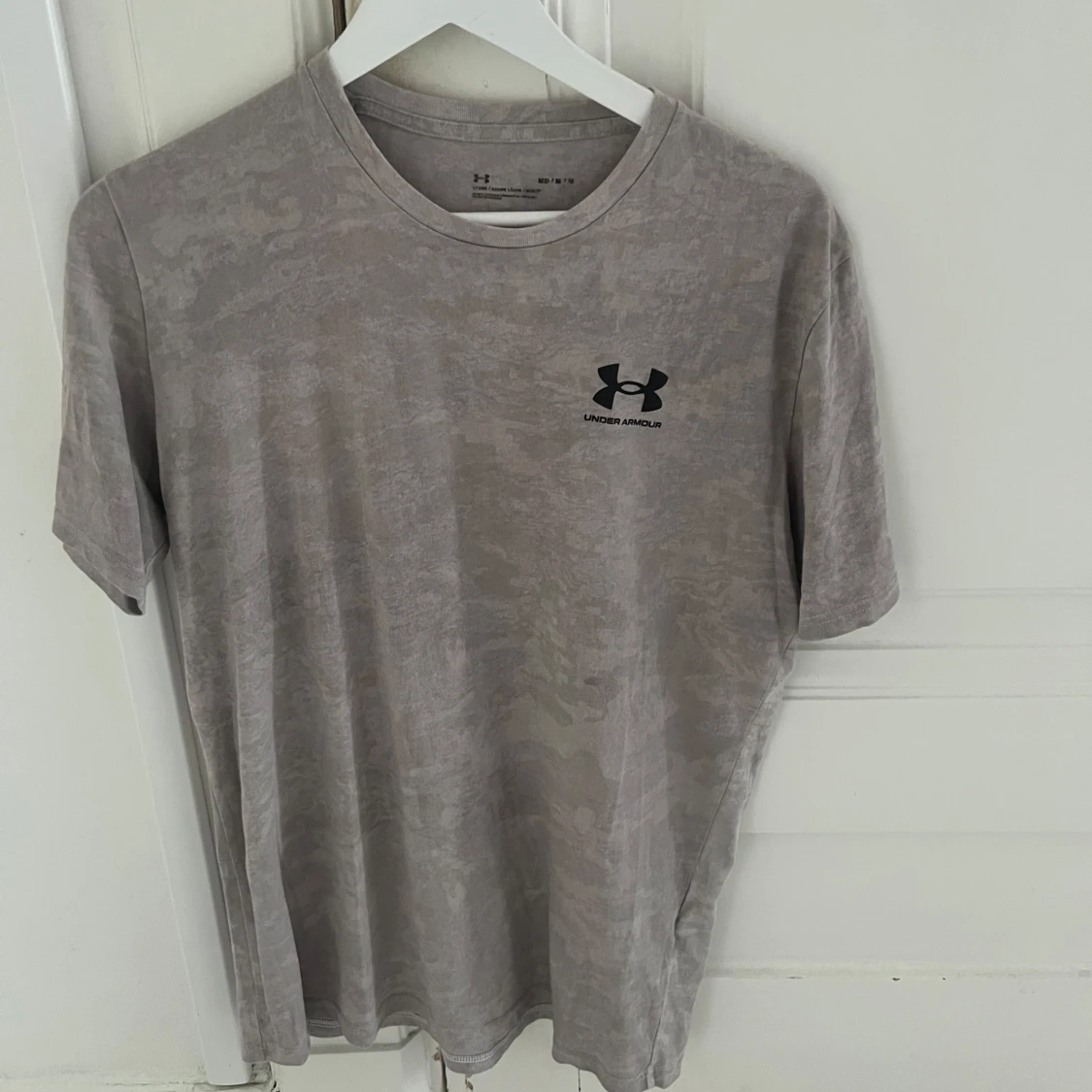 Snygg grå t-shirt från Under Armour med diskret camo-mönster och svart logga på bröstet. Klassisk rund hals och korta ärmar. Perfekt för dig som gillar sportig och stilren look. Lite lätt missfärgad om man kollar noga