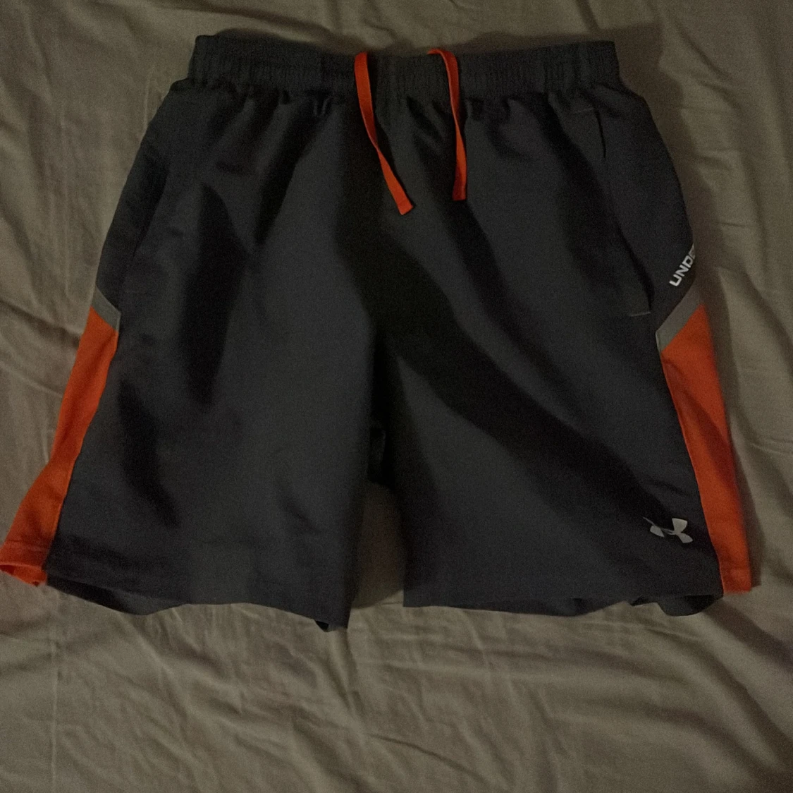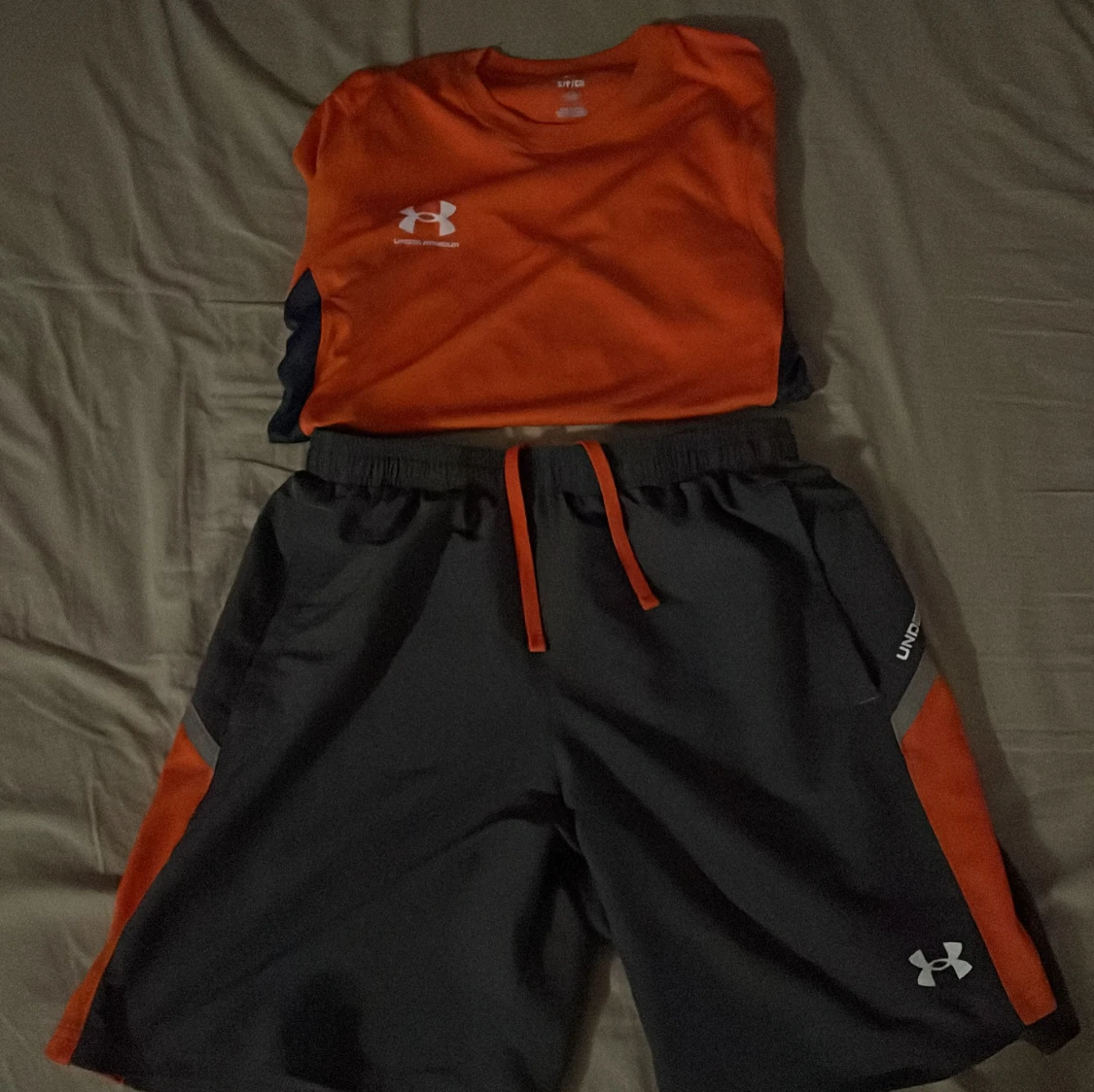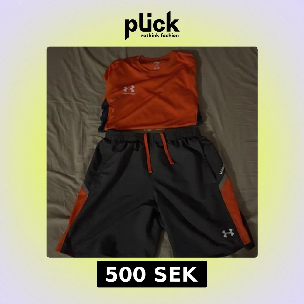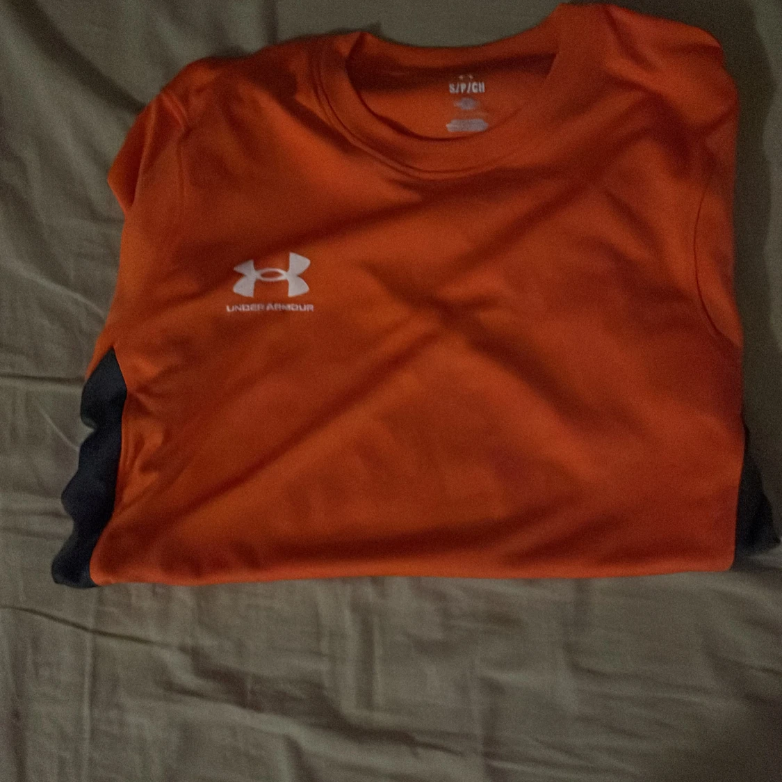 Snygg orange t-shirt från Under Armour med korta ärmar och kontrasterande mörkblå sidopaneler. Perfekt för träning eller en aktiv dag. Logotypen är tryckt på bröstet.