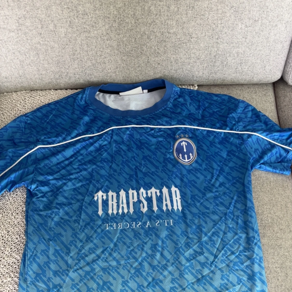 Säljer en blå fotbollströja från Trapstar i storlek S. Den är nästan aldrig använd/nytt skick.