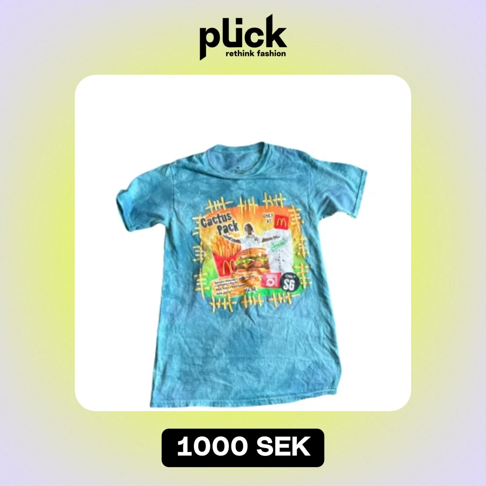 Säljer en cool blå t-shirt med Cactus Pack-tryck från McDonald's. T-shirten är i storlek M och har ett färgglatt tryck på framsidan med en hamburgare, pommes frites och en Sprite. Perfekt för dig som gillar unika och roliga t-shirts! Den är i bra skick och redo för en ny ägare.