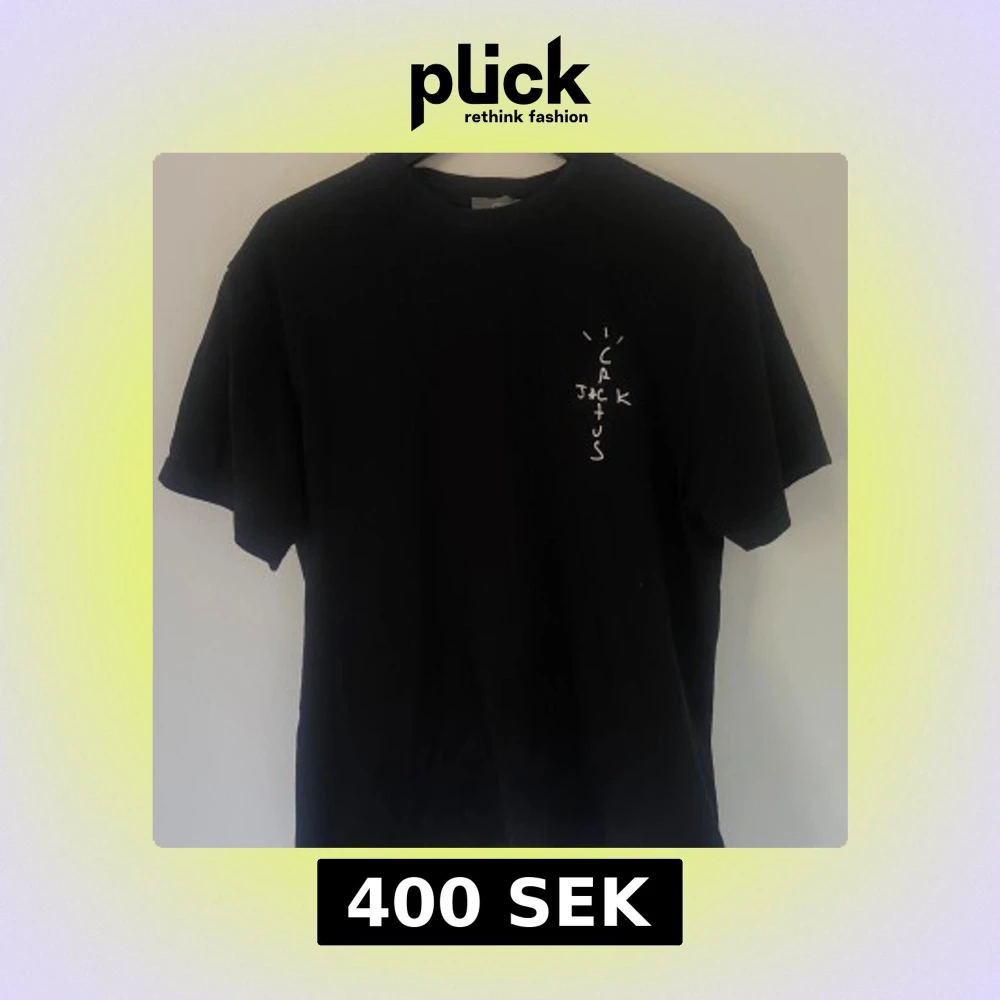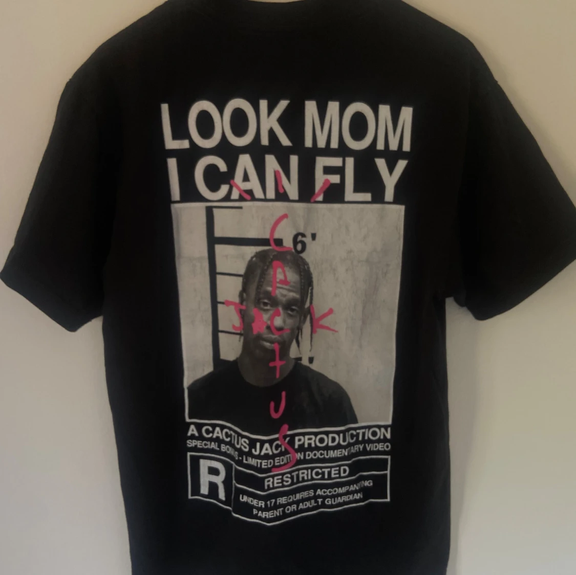 Svart t-shirt från Cactus Jack med tryck på bröstet och stor grafisk print på ryggen med texten 'LOOK MOM I CAN FLY' över Travis Scotss mugshot. T-shirten har klassisk passform och är gjord i mjuk bomull. Perfekt för dig som gillar streetwear och Travis Scott vibes.