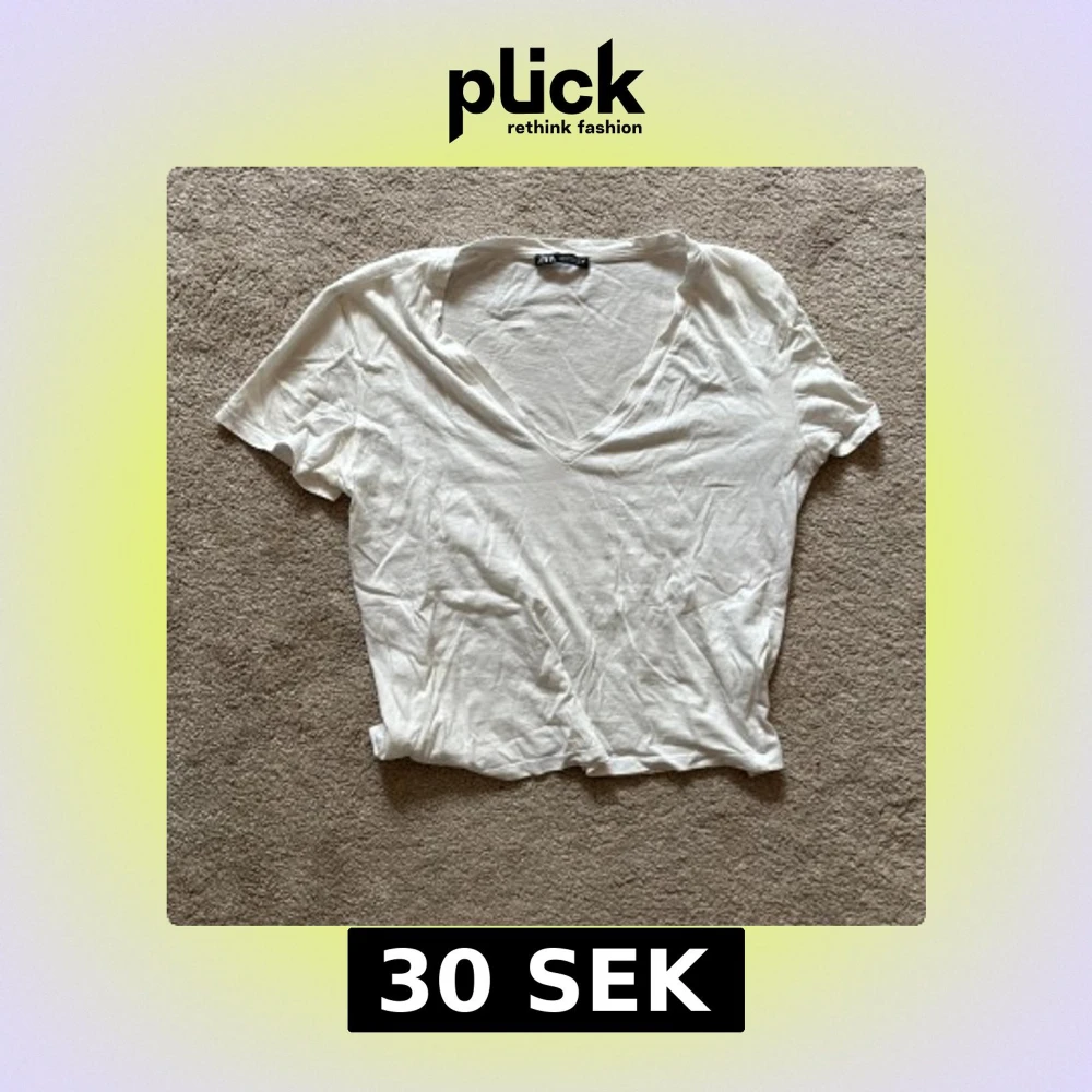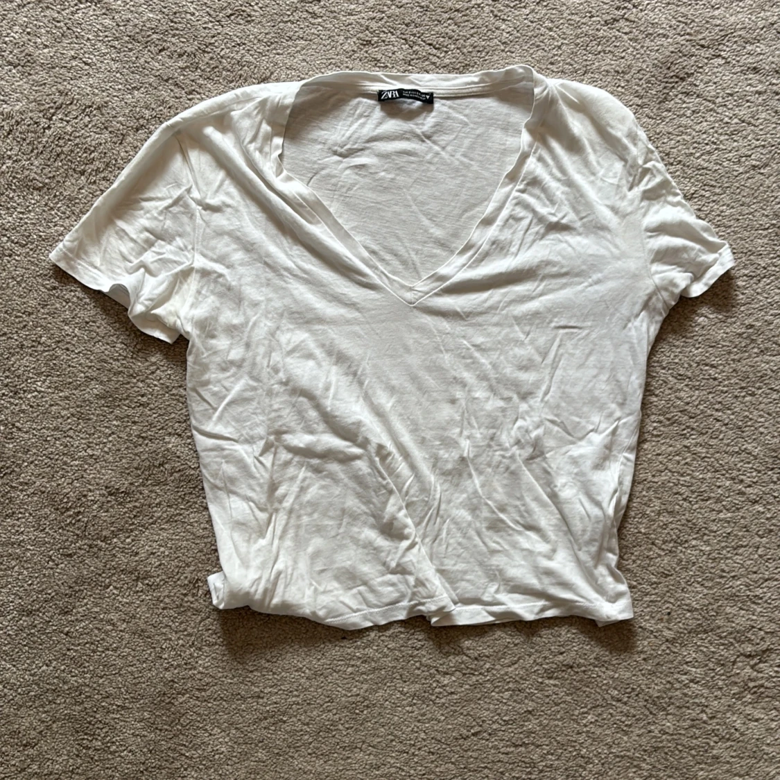 Vit t-shirt från Zara med v-ringning och korta ärmar. Tillverkad i mjuk bomull och har en avslappnad passform. Perfekt basplagg att styla till olika looks.