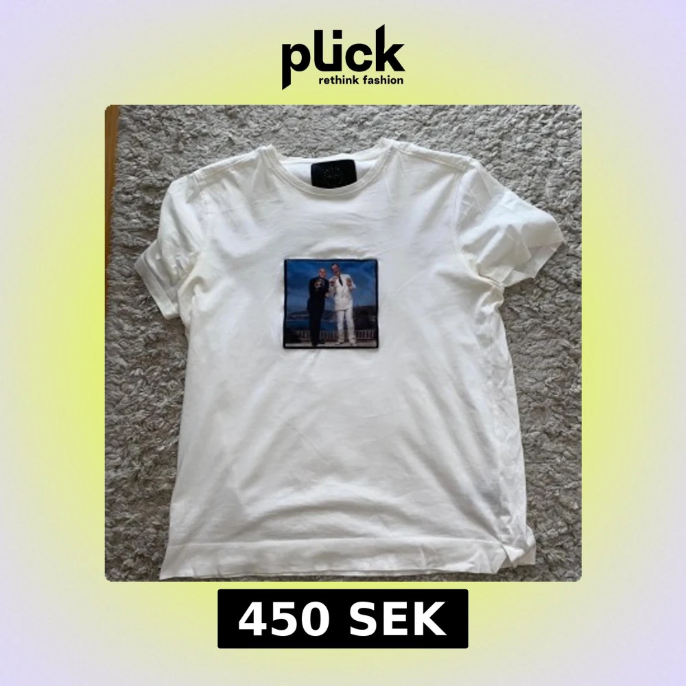 Vit T-shirt från Limitato med ett stort, färgstarkt print på bröstet som föreställer två personer i kostym. Klassisk rund hals och korta ärmar. Materialet är mjuk bomull och t-shirten kommer i exklusiv originalförpackning med Limitato-logga.