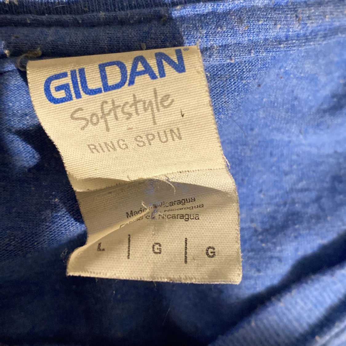Blå T-shirt med tryck - storlek L - använd men i bra skick har suttit på mig 179 cm@80kg