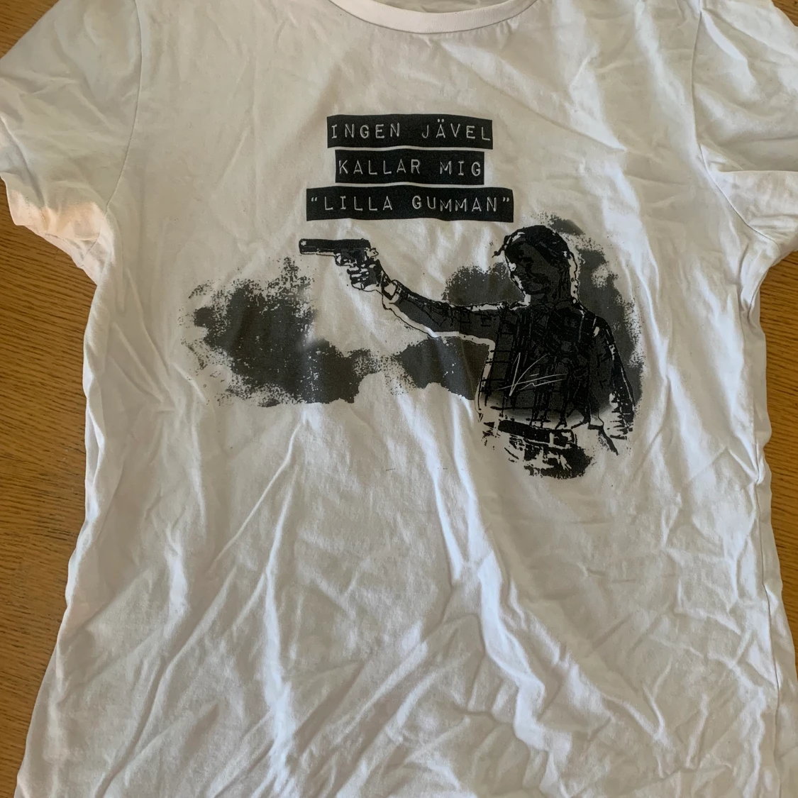 Härlig T-shirt med texten ”ingen jävel kallar mig lilla gumman”. Köpt för 299 kr. Tight/formsittande T-shirt. Storlek medium.