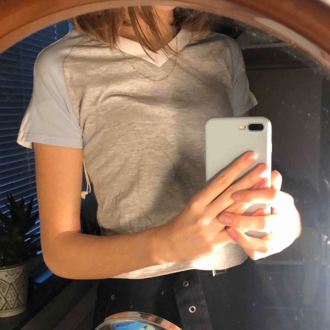 Grå V-ringad tröja med ljus blåa armar och vit ”krage” från harlow. Knappt använd dock ingen prislapp kvar