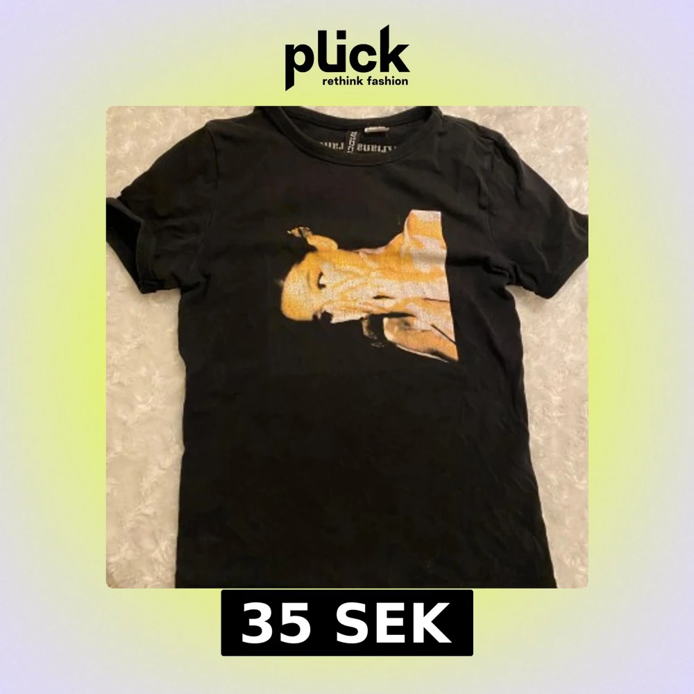 Snygg svart t-shirt från H&M Divided med ett tryck av en guldfärgad bild på framsidan. Perfekt för en casual look.