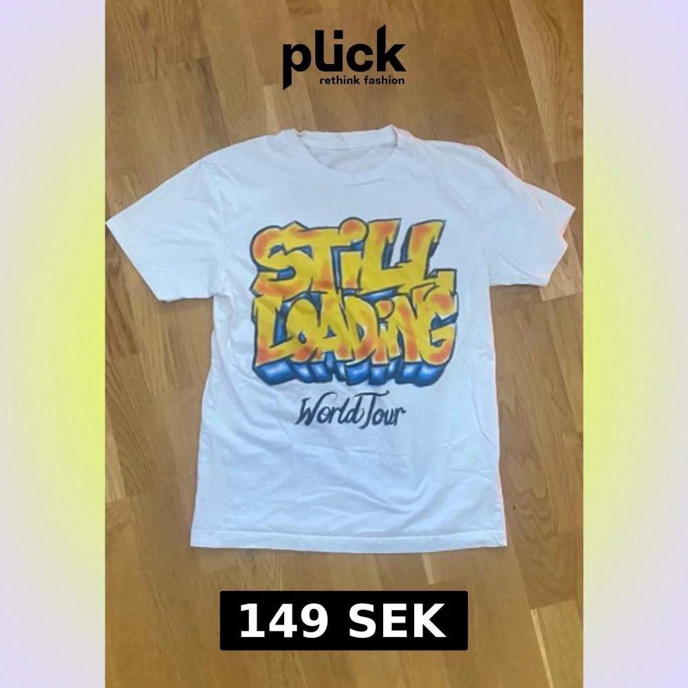 Vit t-shirt från Central Cees koncert i Sverige. På framsidan står det 'Still Loading World Tour' i gult, orange och blått, och på baksidan finns en filmklappa med texten 'Live Yours'. Klassisk passform och rund halsringning.