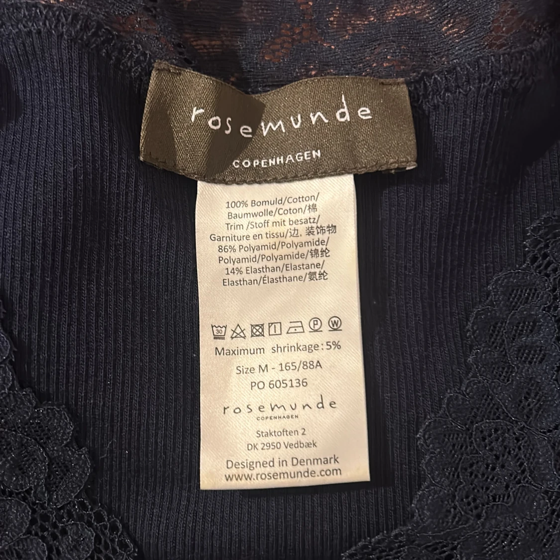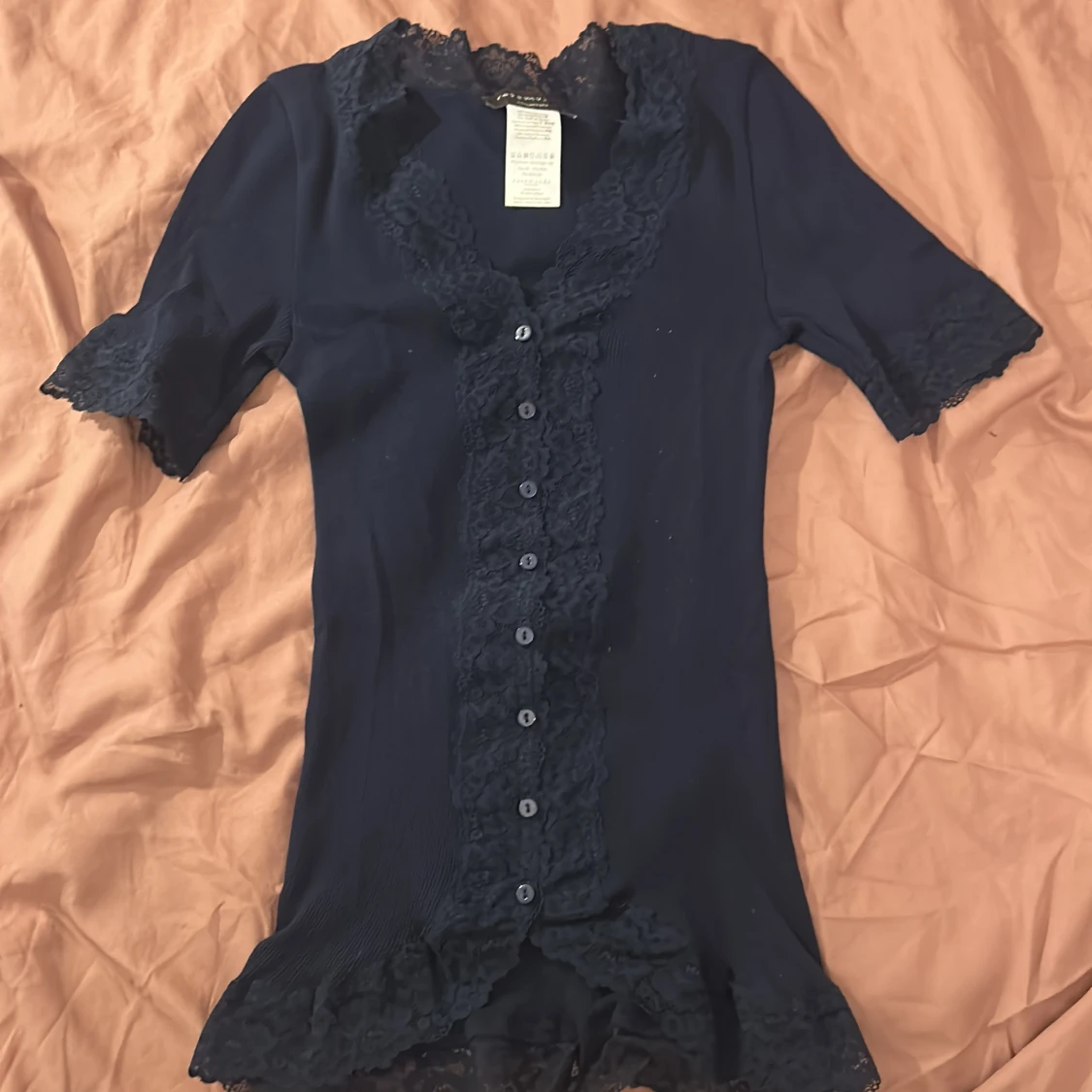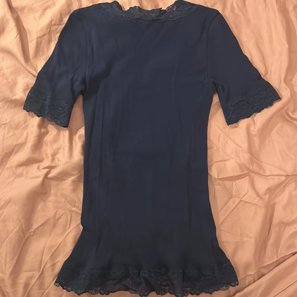 Aldrig använt marinblå spets-tshirt. Jätte söt och skön. 100% bomull. Säljer på grund av att jag inte gillar spets. Orginalpris: 249kr.