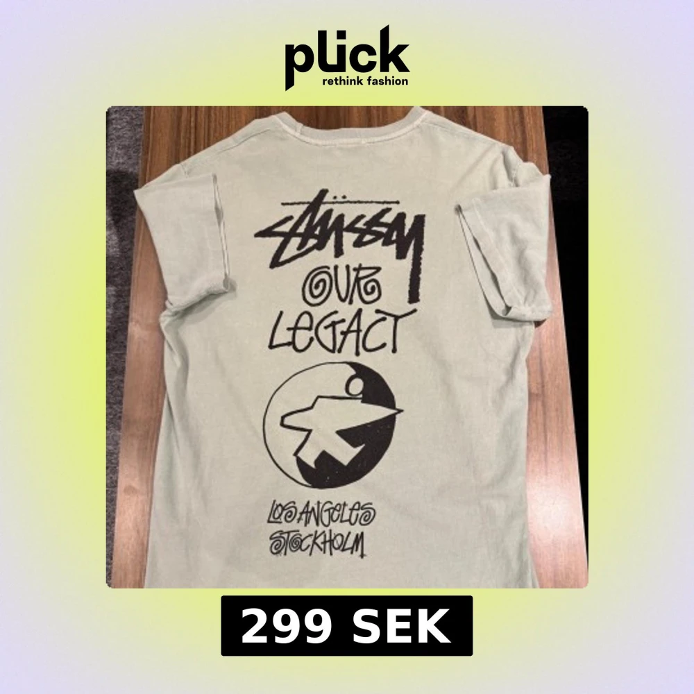 Mintgrön t-shirt från Stüssy x Our Legacy med svart grafiskt tryck på både bröstet och ryggen. Trycket har coola handskrivna bokstäver och en stor grafisk symbol på ryggen. T-shirten har rund hals och korta ärmar, tillverkad i mjuk bomull. Size S, passar även M. Finns nån fläk men går nog bort i tvätt! 299kr Allt gott, Brur🫰🏽