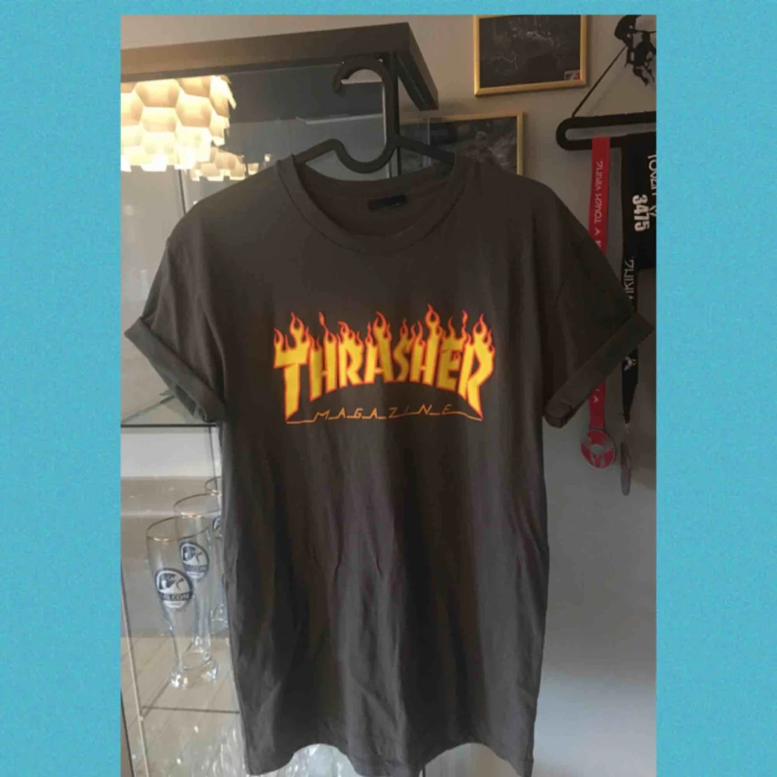 Thrasher T-shirt med små fläckar som syns på bild 2. Bortklipp lapp men skulle säga storlek M