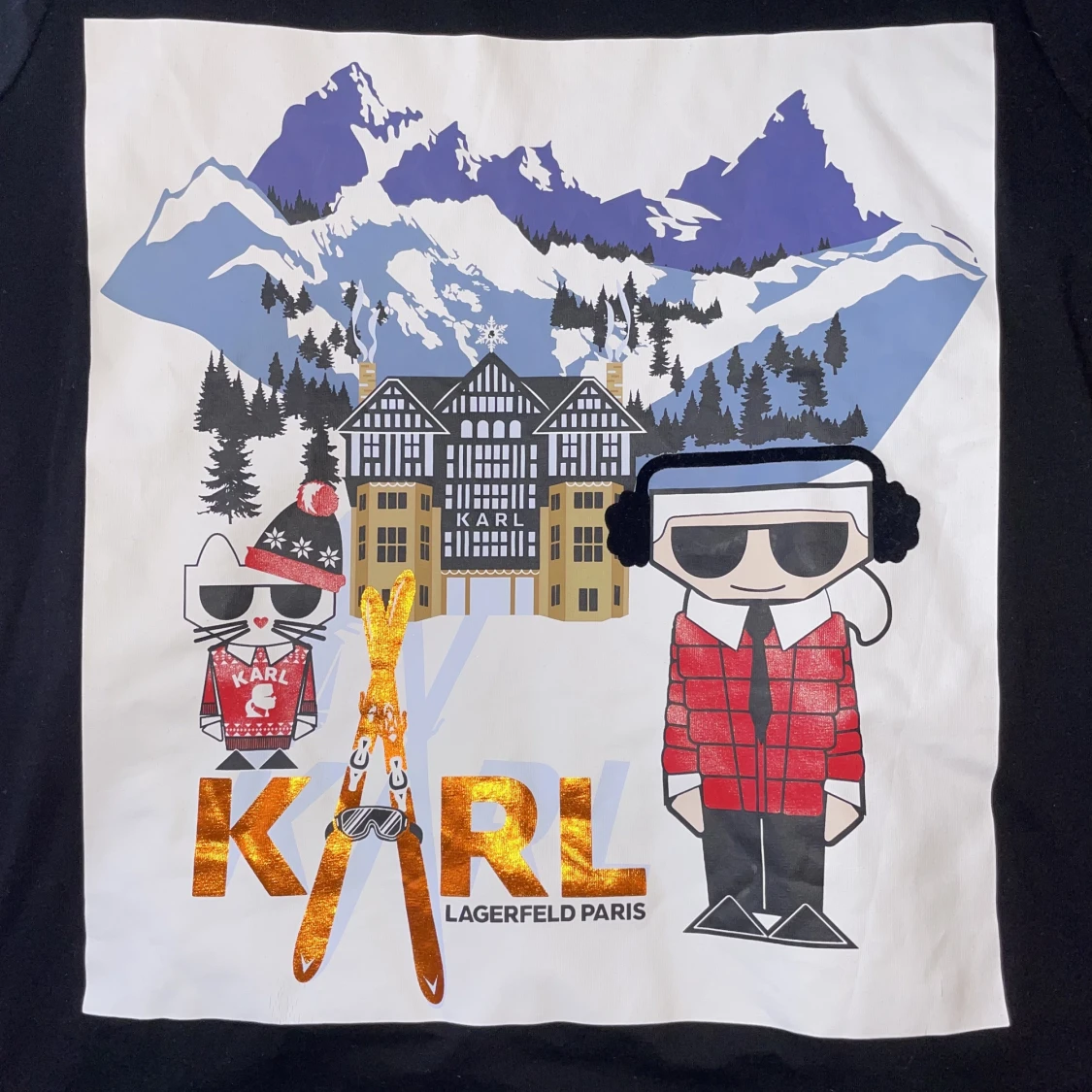 T-shirt med tryck från Karl Lagerfeld, med 3D material på öronmuffarna. Helt ny, oanvänd med lappar kvar. Perfekt till afterski men funkar också till vardags.