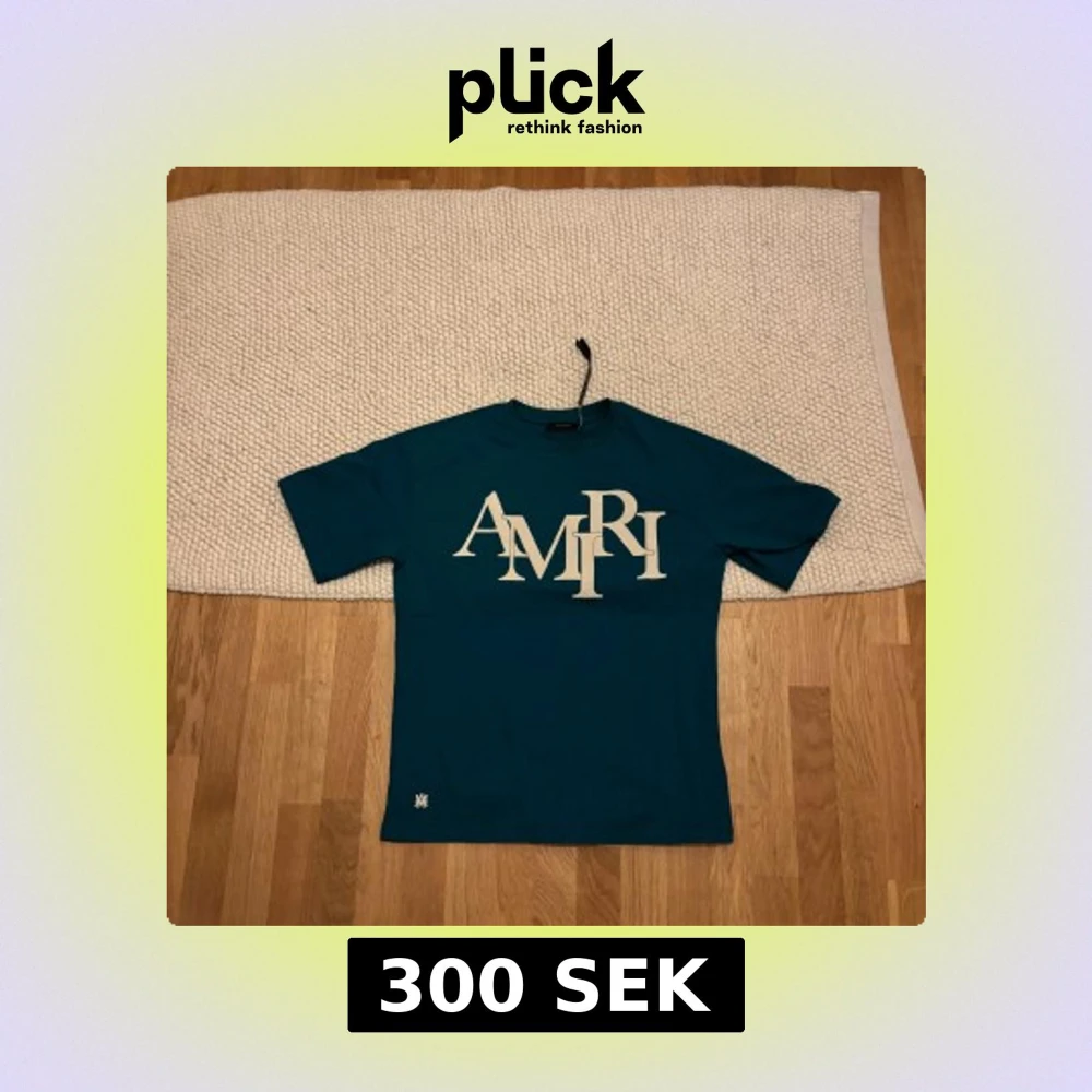 Aldrig använd, Snygg turkos t-shirt från AMIRI med stor vit logga framtill. Klassisk passform med rund hals och korta ärmar. Tillverkad i mjuk bomull som känns skön mot huden. Perfekt för dig som gillar streetwear och vill sticka ut med en exklusiv look.