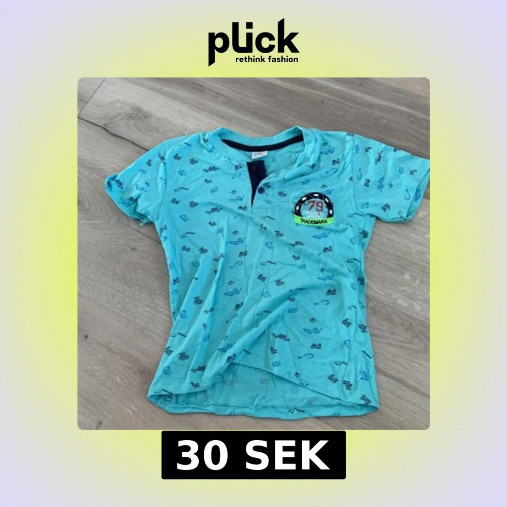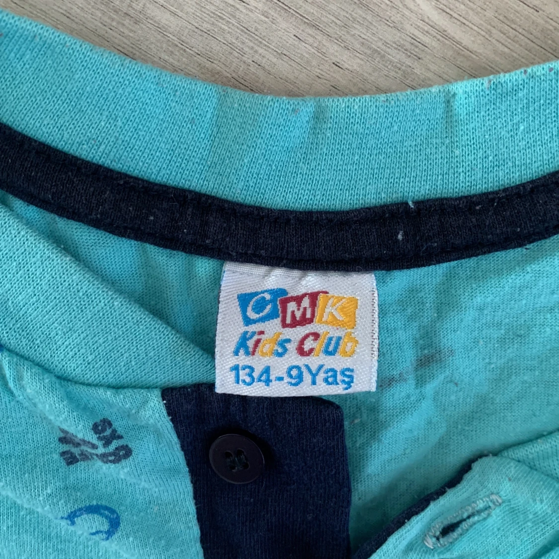 Säljer en turkos t-shirt från CMK Kids Club med ett coolt tryck och knappar vid halsen. Perfekt för sommarens äventyr! 💙*Barnsize