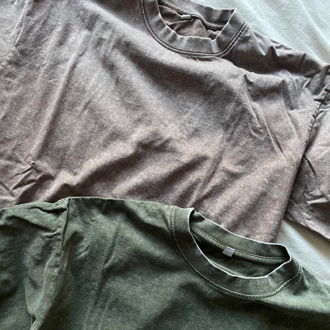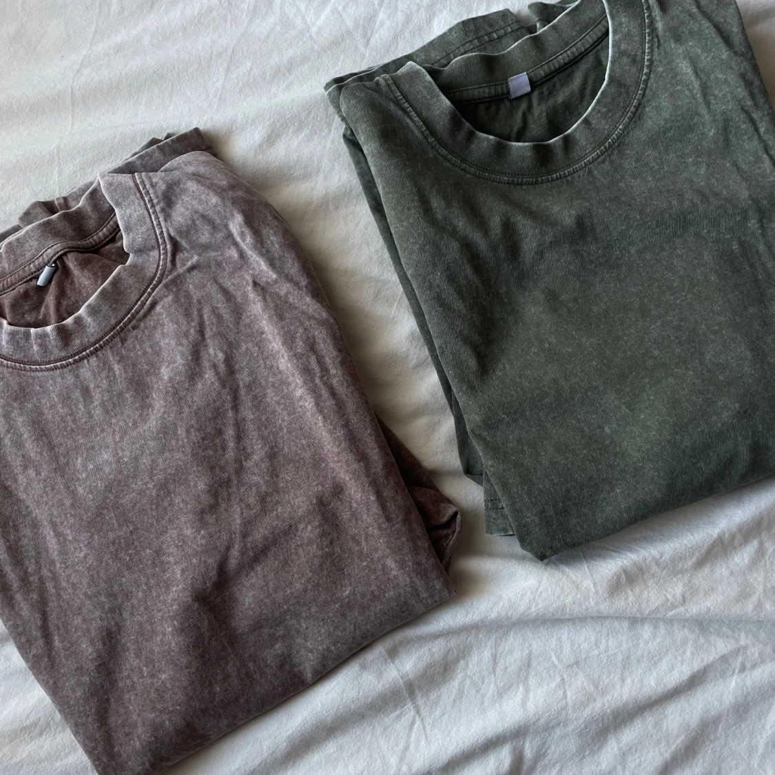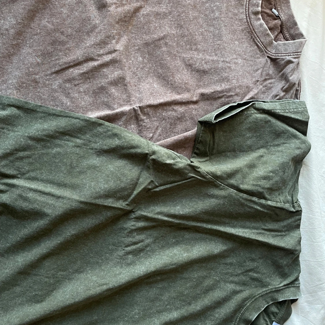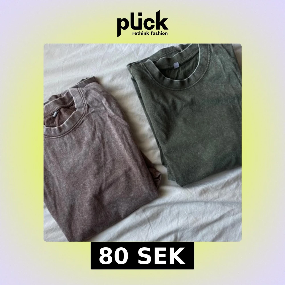 Köp 1 för 80kr, 2 för 140kr. Säljer två stilrena t-shirts i tvättad look, en i dämpad grön och en i dov brunlila färg. Båda har rund halsringning och korta ärmar. Perfekta för en avslappnad och trendig stil.😮💨Säljer då min bror aldrig använt dem, precis som ny🤩‼️