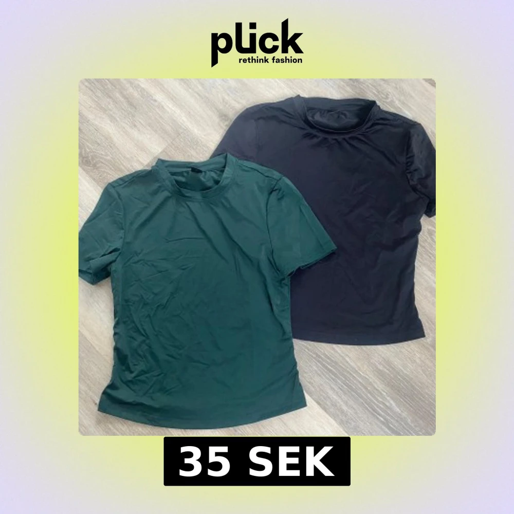 Säljer två enkla t-shirts i storlek XS. En är svart och en är mörkgrön, båda med rund hals och korta ärmar. Materialet känns mjukt och stretchigt