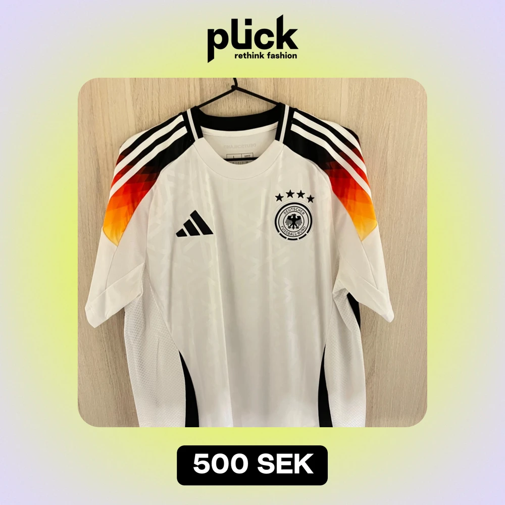 Säljer en vit fotbollströja från Adidas med Tysklands landslagsemblem och tre stjärnor på bröstet. Tröjan har korta ärmar och coola färgdetaljer i svart, rött och gult på axlarna. Namnet 'Sané' och nummer 19 pryder ryggen. Perfekt för fotbollsfans! Bara hängt på väggen ej använd. Köpt från unisport butiken i Stockholm i somras