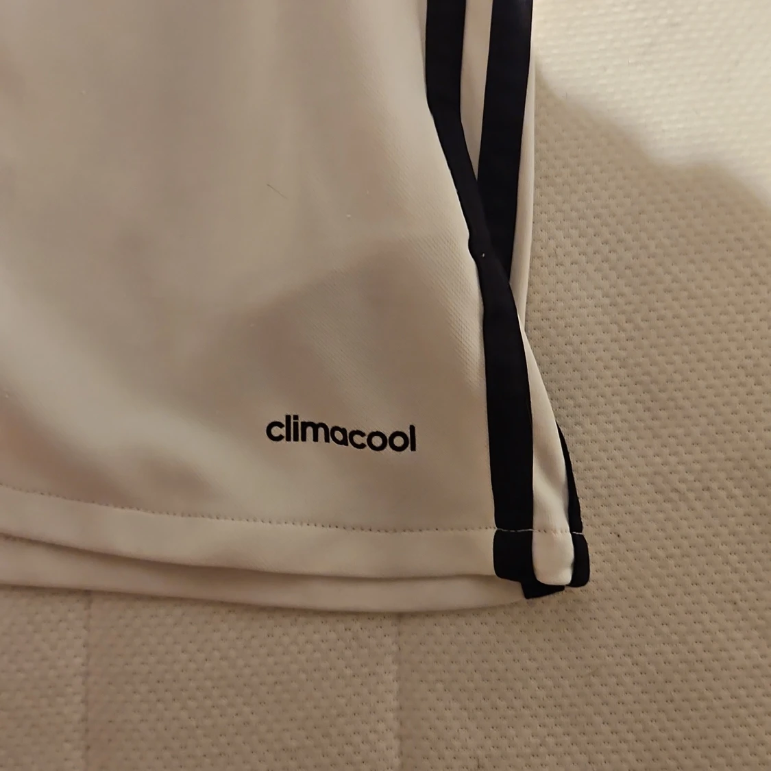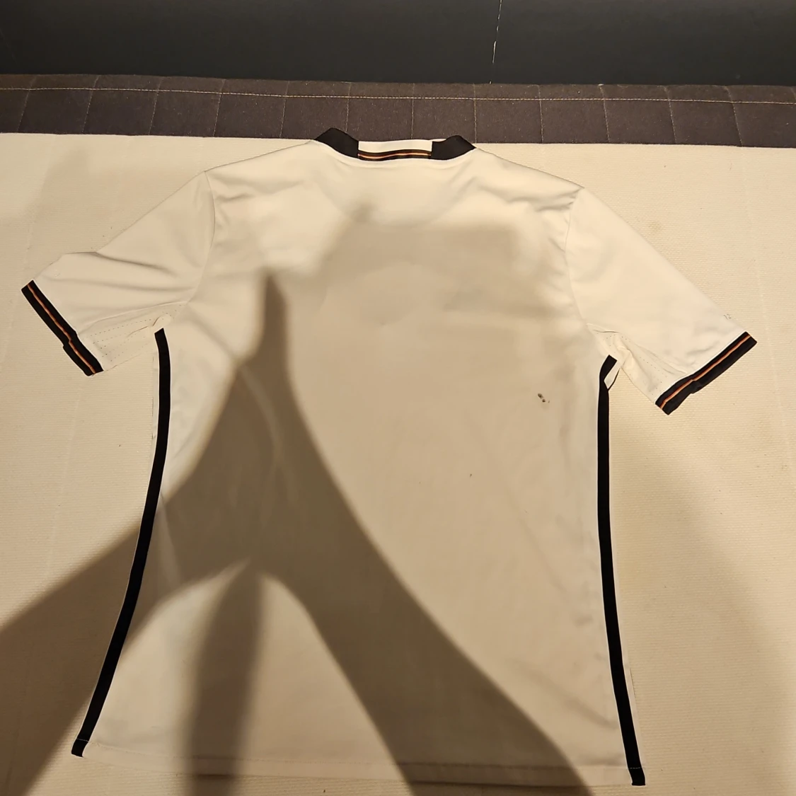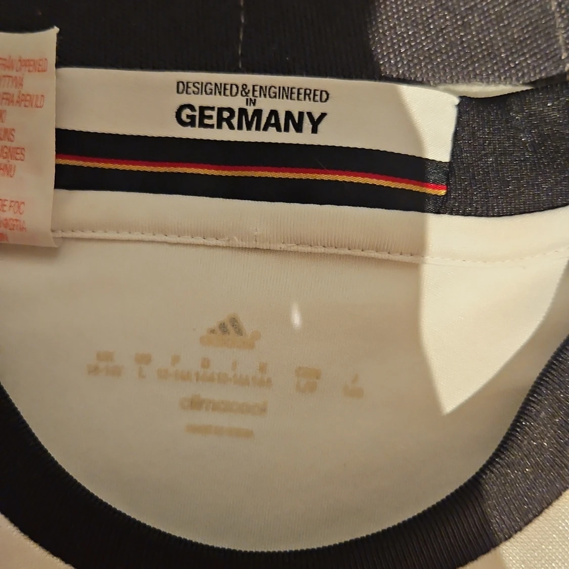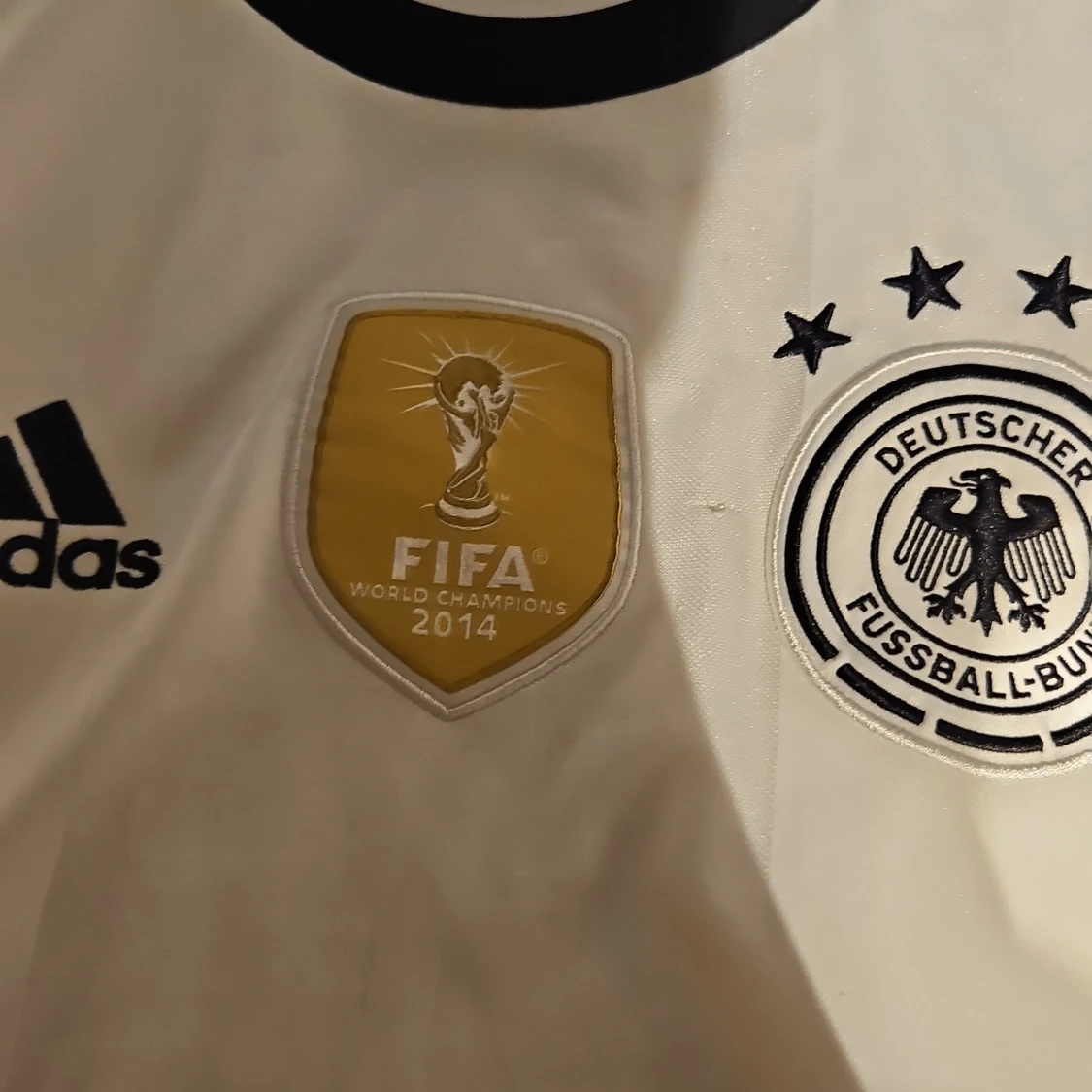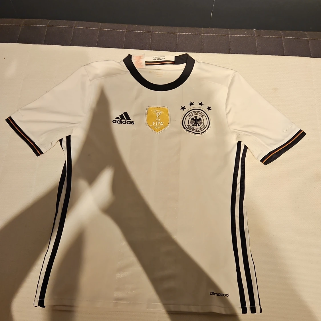 Säljer en officiell Tysklands landslagströja från VM 2014 med FIFA World Champions-märke. Tröjan är vit med svarta detaljer, svarta ränder längs sidorna och svart krage. Korta ärmar med röd, svart och gul kant. Materialet är lätt och andas, climacool-teknologi.