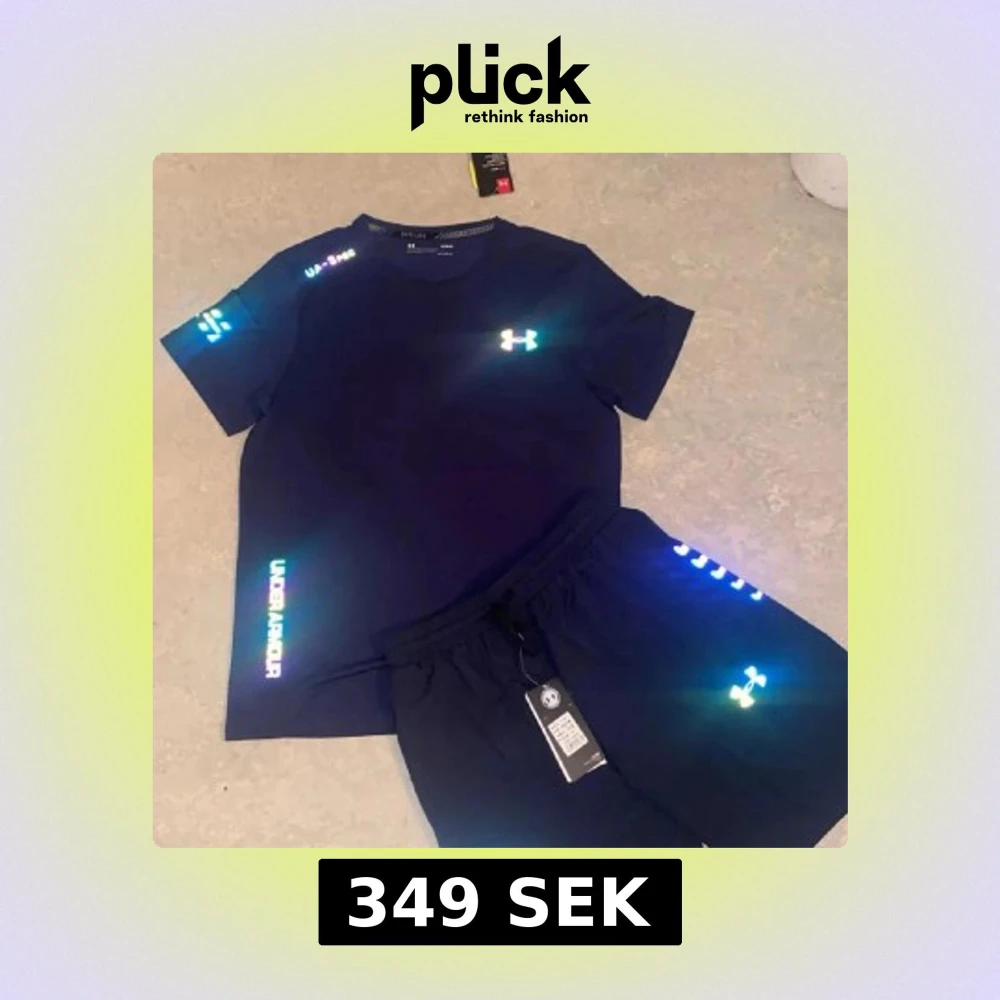 Snygg mörkblå t-shirt och shorts från Under Armour med korta ärmar och logga på bröste och shortsen. T-shirten har en klassisk rund hals och är gjord i mjukt material som passar perfekt för träning. Diskreta detaljer med reflextryck på sidan och ärmen även på shortsen