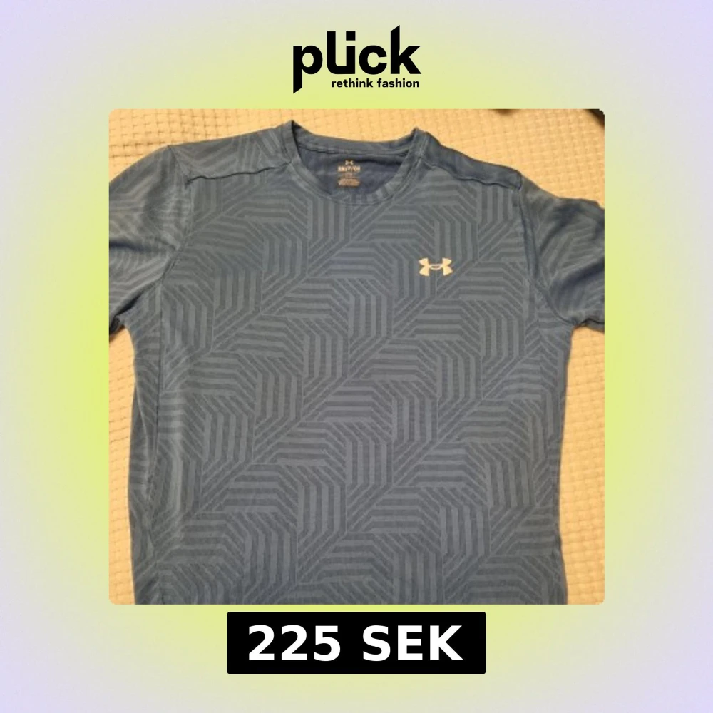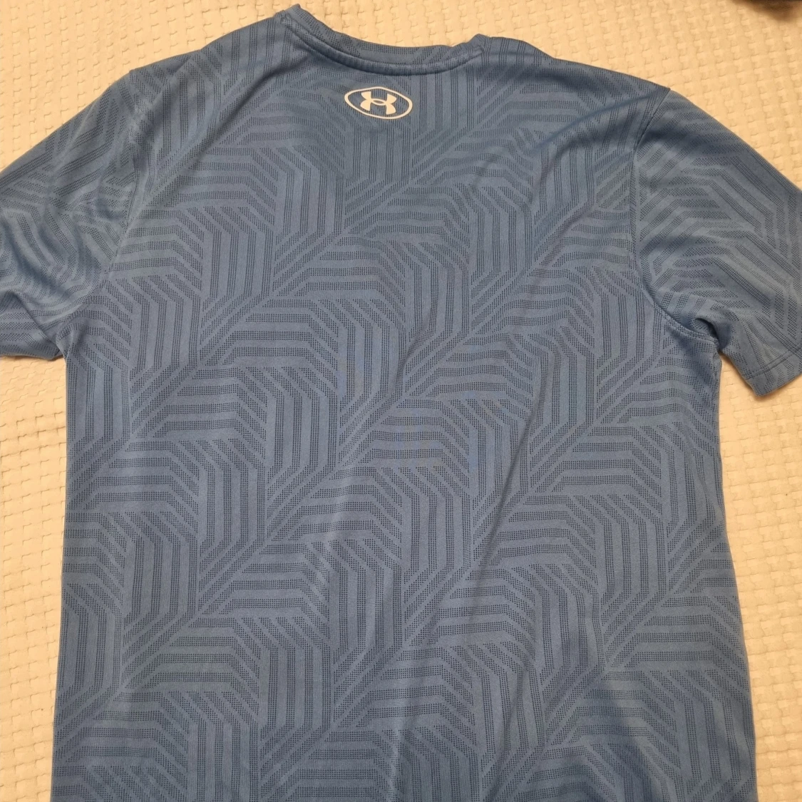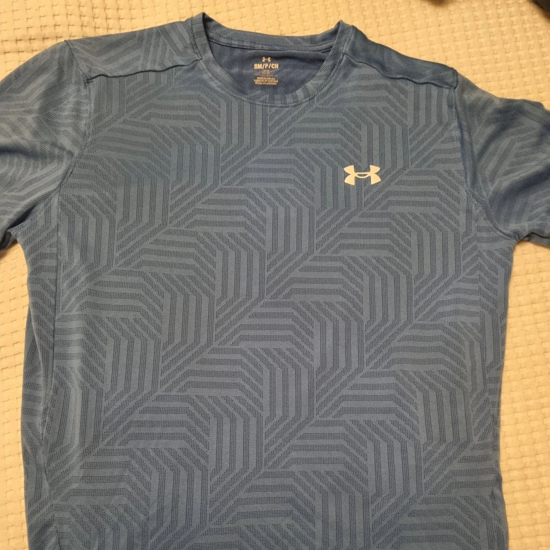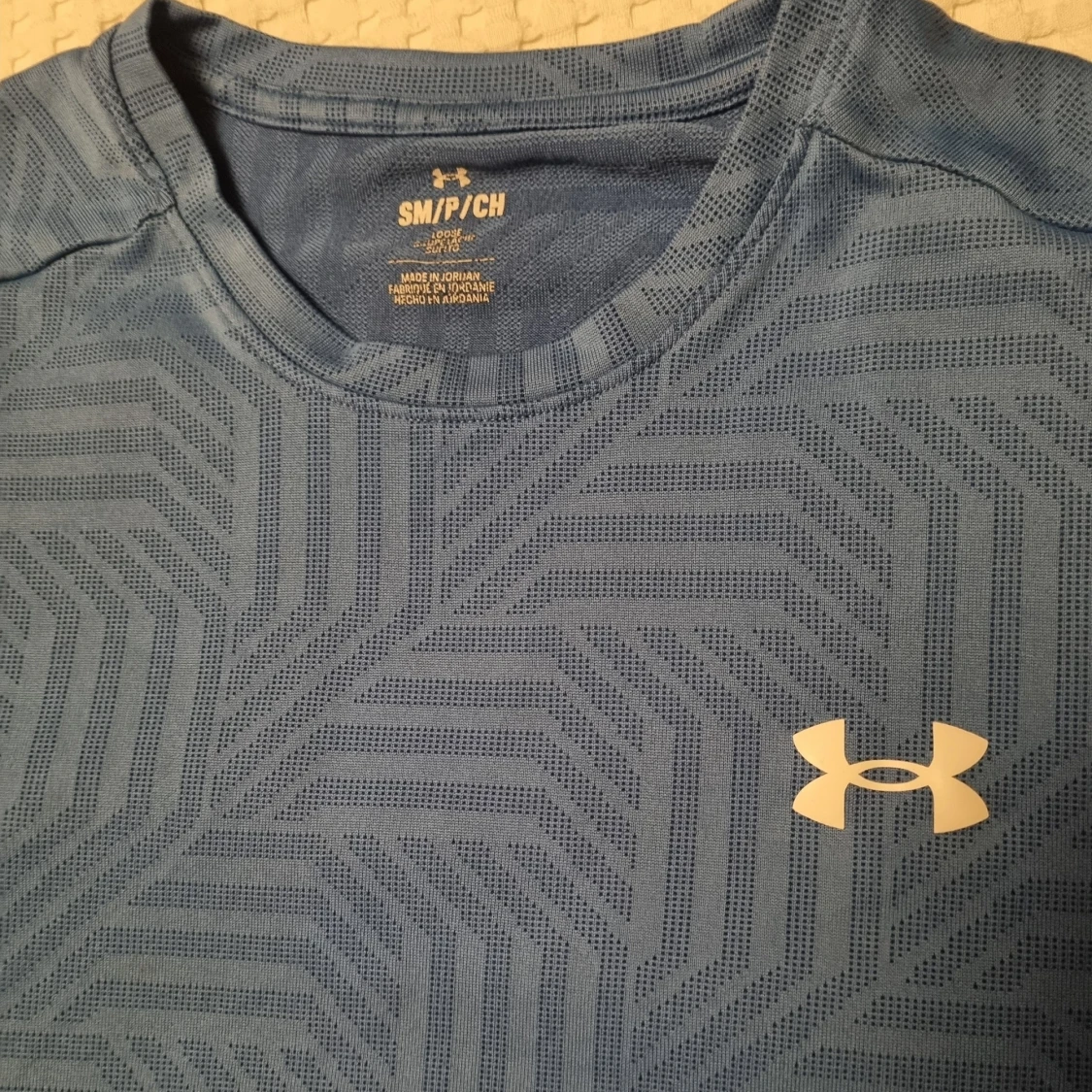 Säljer en blå kortärmad t-shirt från Under Armour med geometriskt mönster och logga på bröstet.