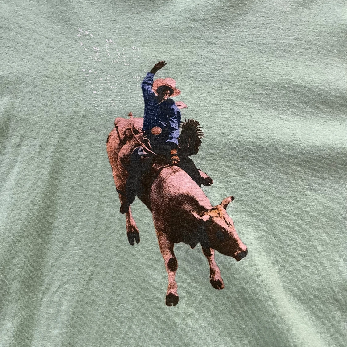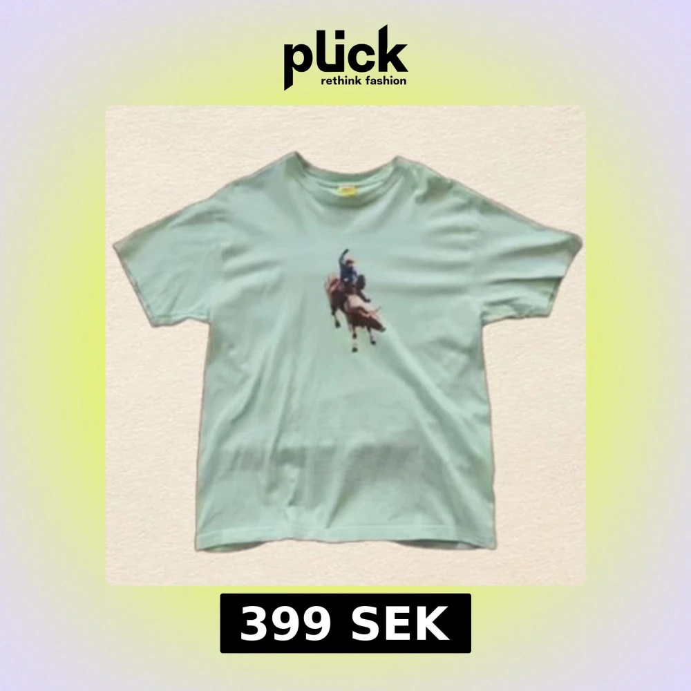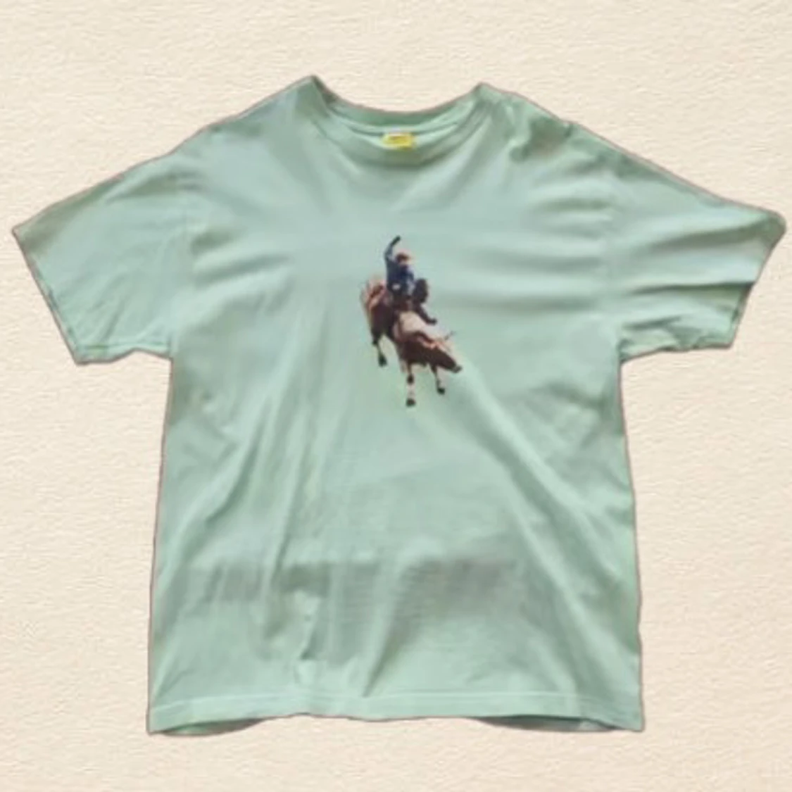 Unik tröja från GOLF WANG, märke av artisten Tyler the Creator. Köpt via mystery box. Mintgrön t-shirt med coolt tryck av en rodeoryttare på tjur mitt på bröstet. Oversized i storlek.