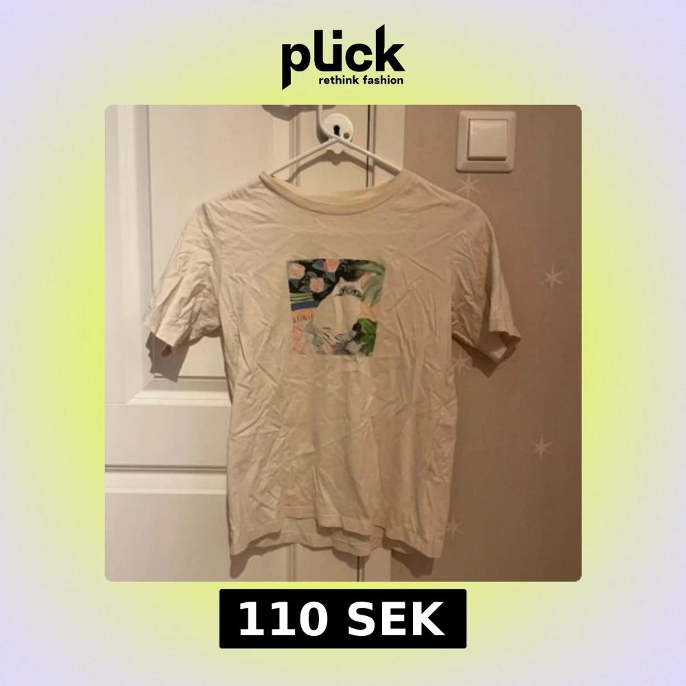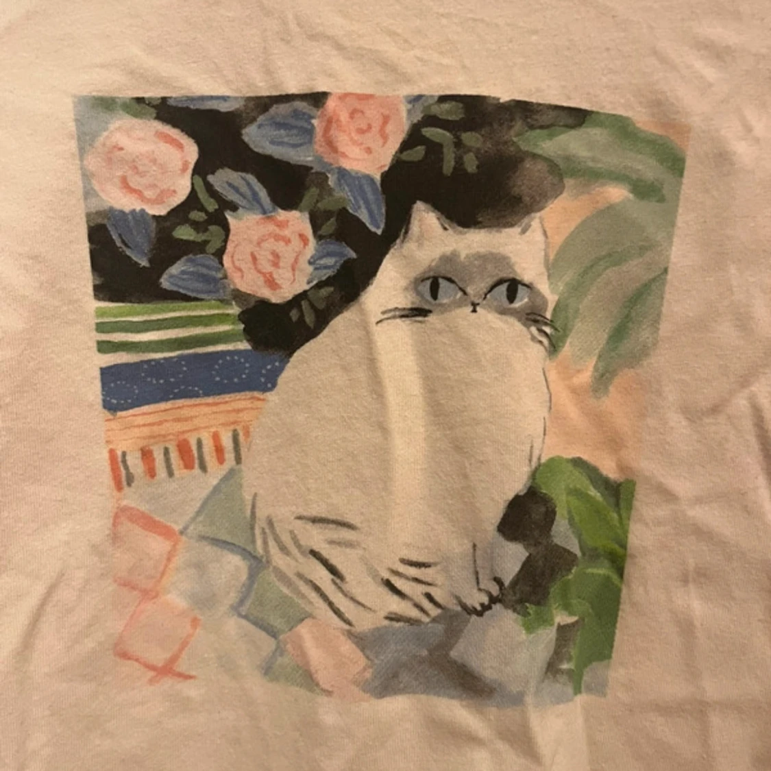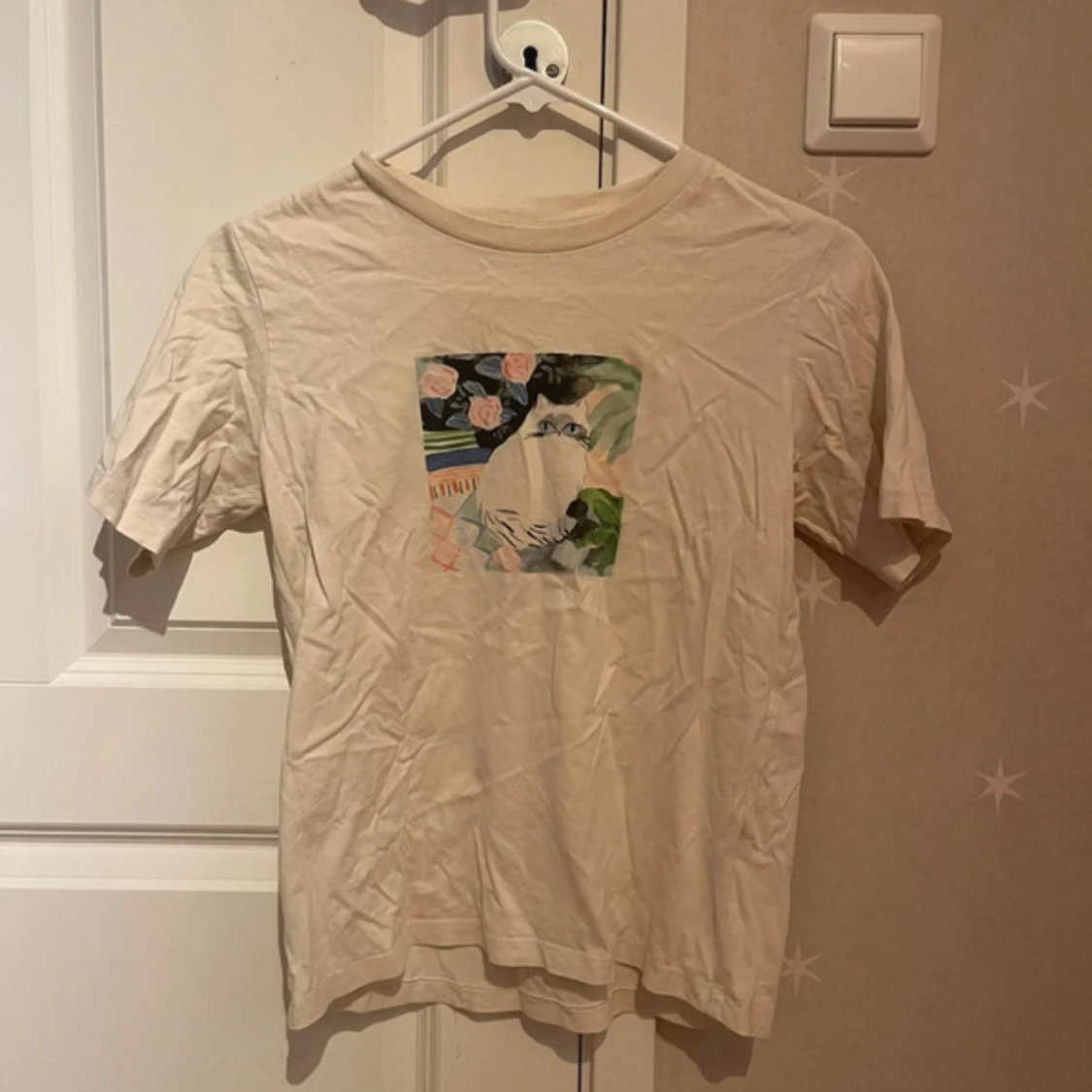 Beige t-shirt från Uniqlo UT i bomull med ett färgglatt tryck av en söt katt och blommor på bröstet. Klassisk passform med rund hals och korta ärmar. Perfekt för dig som gillar unika prints och vill sticka ut lite extra.