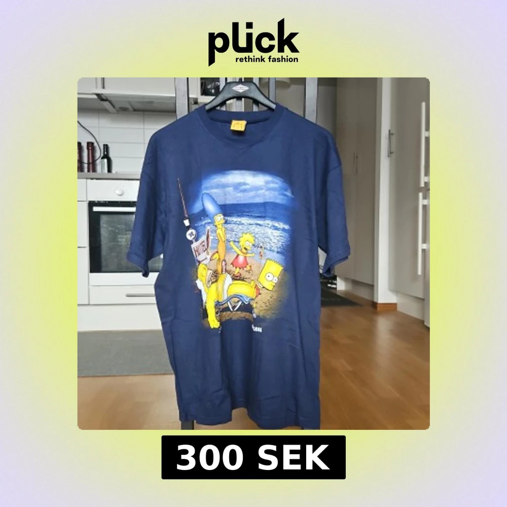 Mörkblå t-shirt med stort tryck av The Simpsons på stranden.