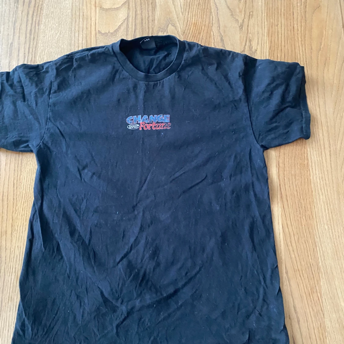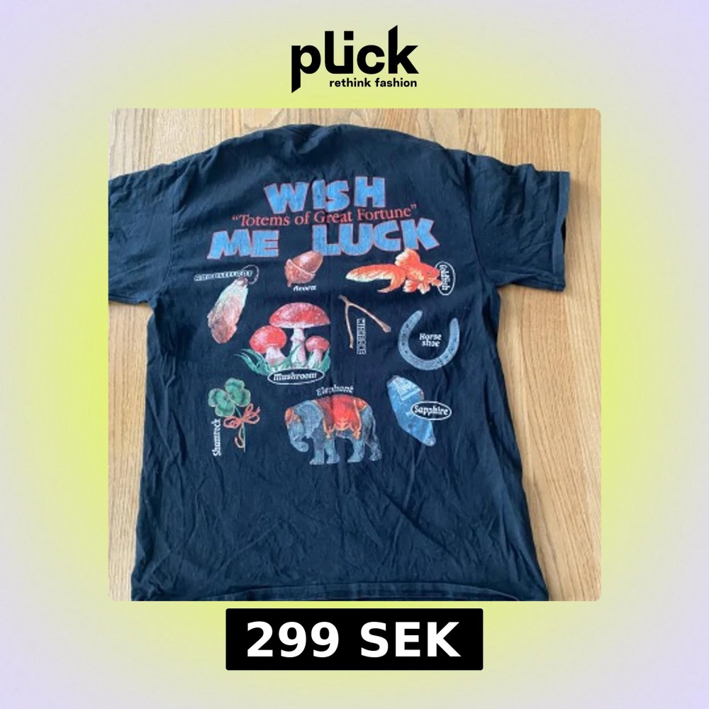 Cool svart t-shirt från Urban Outfitters med stort färgglatt tryck på ryggen med texten 'Wish Me Luck' och olika lyckosymboler. Framsidan har ett litet tryck på bröstet. Perfekt för dig som gillar unika prints! Passar S också!