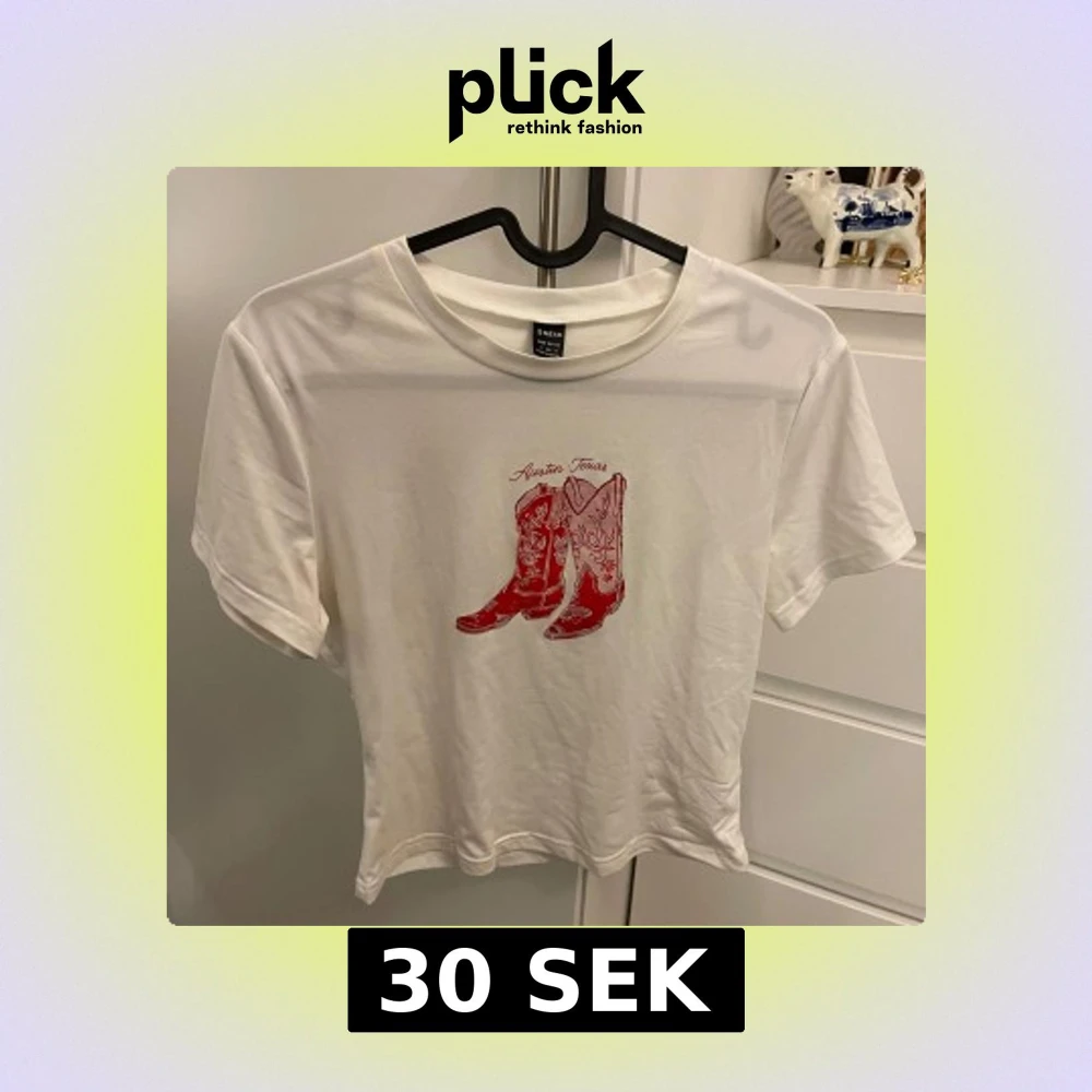 Säljer en vit t-shirt från Shein med ett tryck av röda cowboyboots och texten 'Austin Texas' på framsidan. Perfekt för en avslappnad stil med en touch av westernkänsla. T-shirten har korta ärmar och rund halsringning.