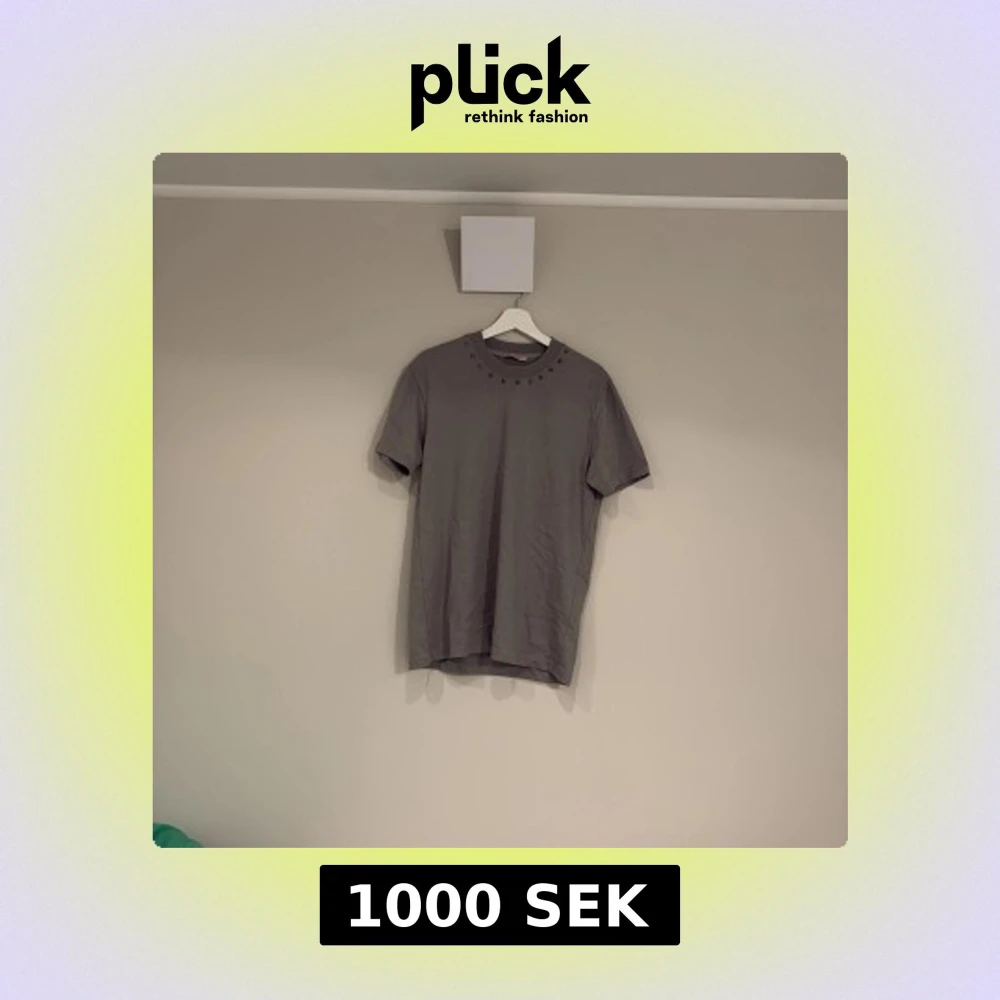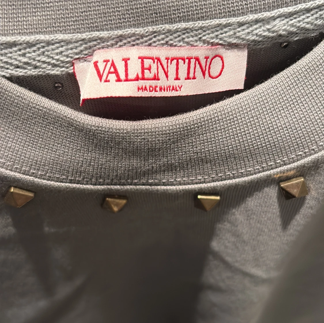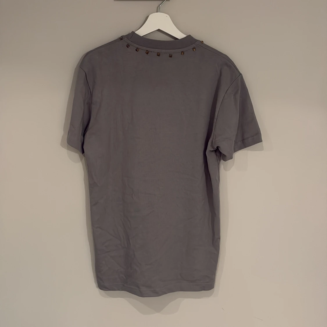Snygg grå/gön t-shirt från Valentino med coola guldfärgade nitar runt halsringningen. Klassisk passform och tillverkad i mjuk bomull. Perfekt för dig som vill ha en stilren men edgy look.