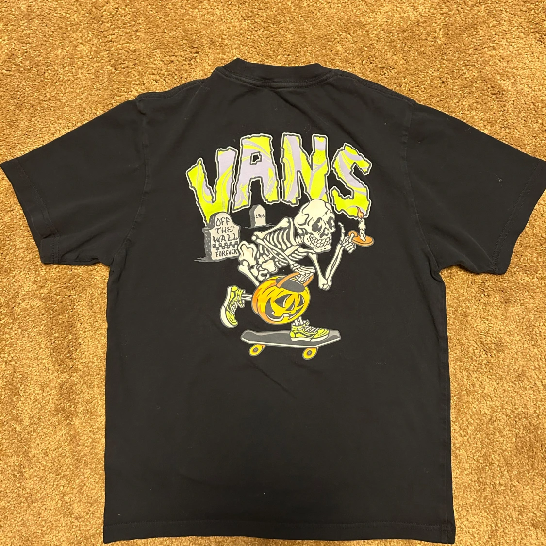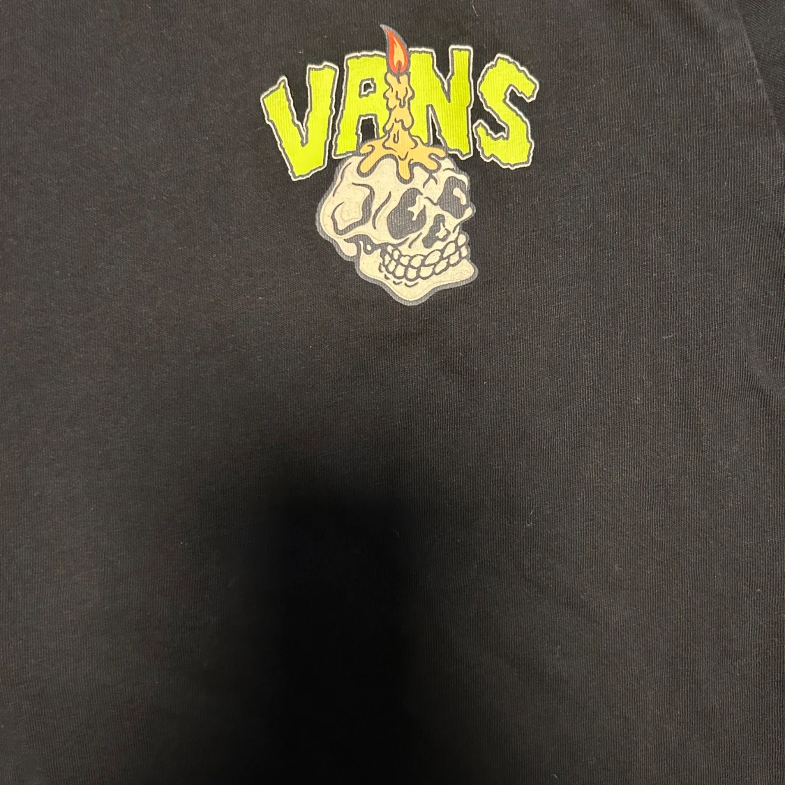 Cool svart t-shirt från Vans med färgglatt tryck av döskalle och skateboard på ryggen samt mindre logga framtill. Perfekt för dig som gillar streetwear och skate-stil. Skön passform och klassisk rund hals. Storlek L barn