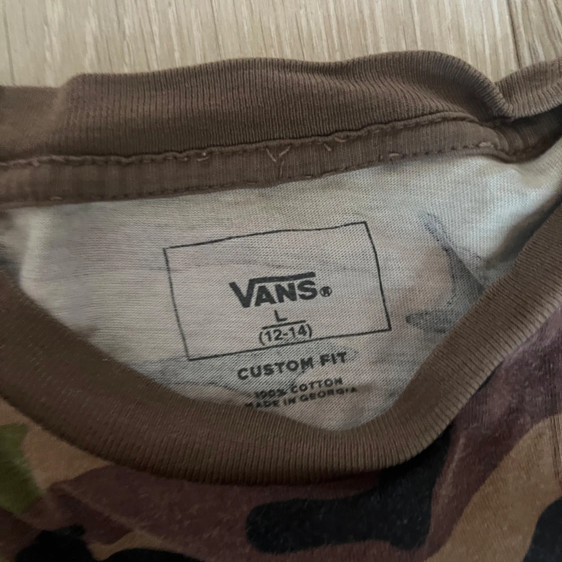 Säljer en cool camouflage t-shirt från Vans i storlek L. T-shirten har ett stort Vans-tryck på framsidan och är tillverkad i 100% bomull. Perfekt för en avslappnad stil.