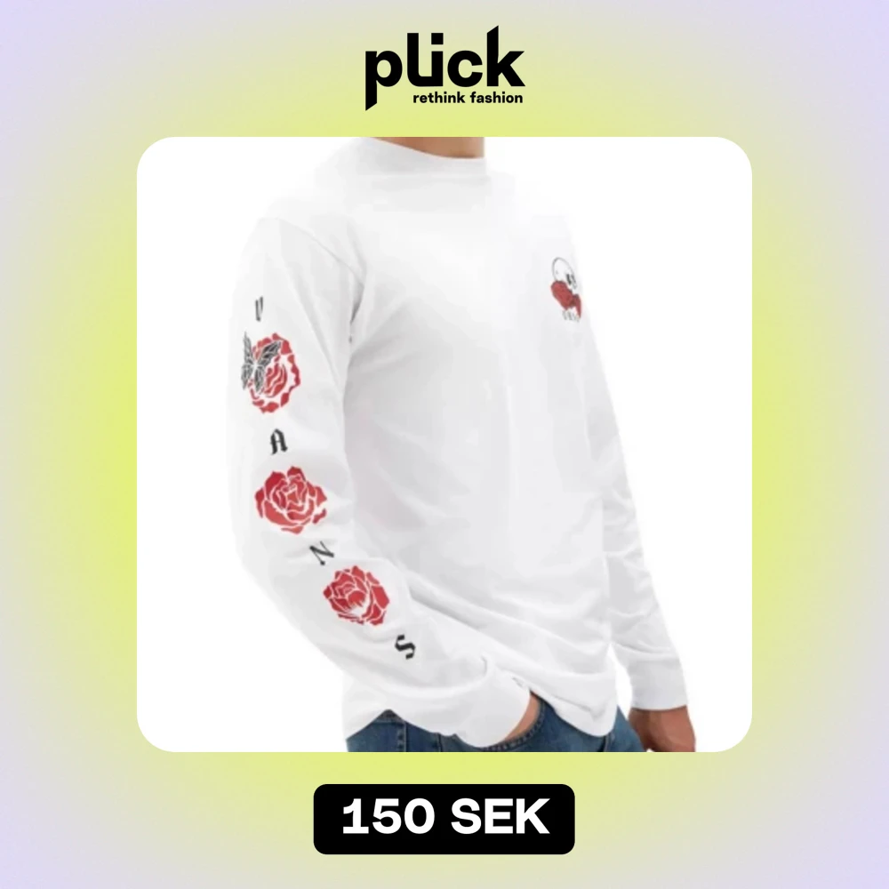 Långärmad i t-shirt material vit vans tröja med tryck i storlek large/L, i använt skick där man ser på sista bilden ett litet litet hål ifrån larmet som satt på i butik och små fläckar på mudden vid handen som också finns på bild nmr 3