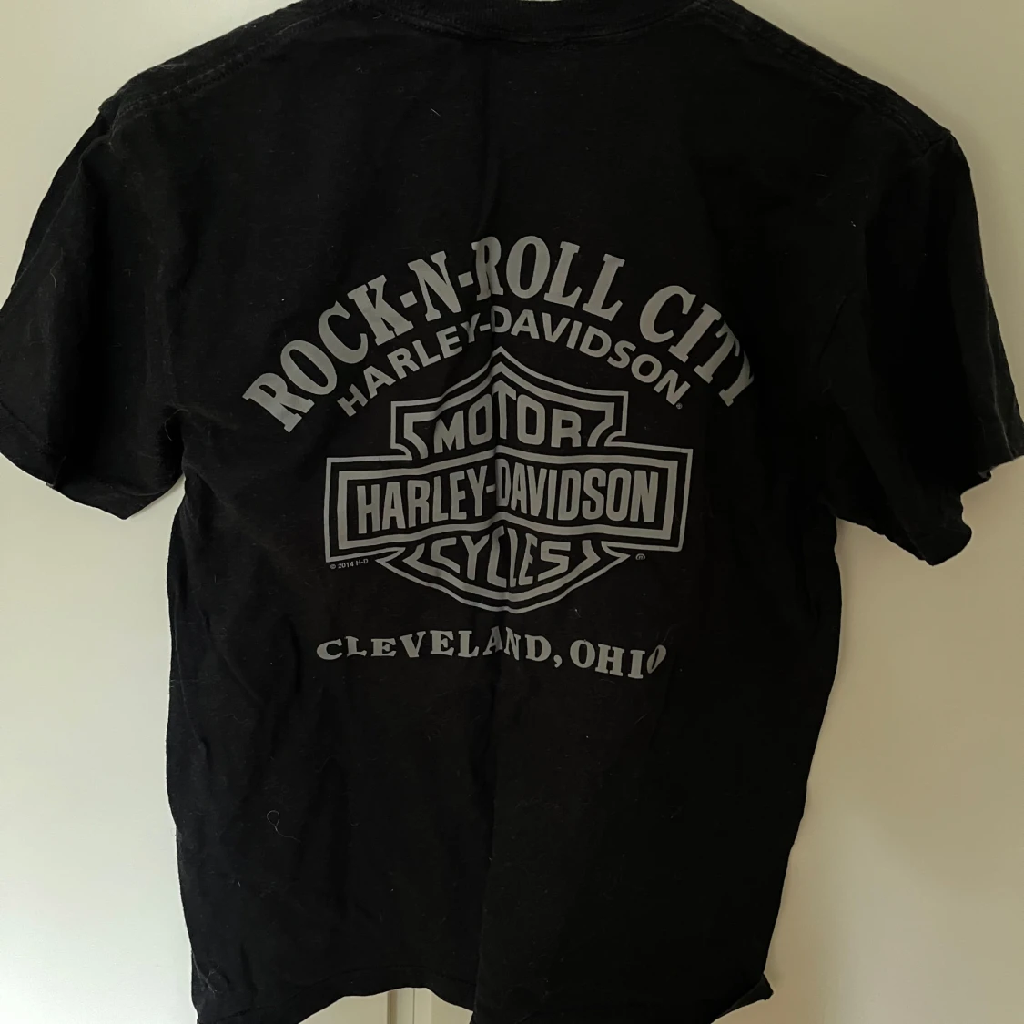 Svart t-shirt från Harley-Davidson med tryck både fram och bak. Framsidan har klassisk Harley-logga, medan baksidan har stort tryck med 'Rock-N-Roll City Cleveland, Ohio'.