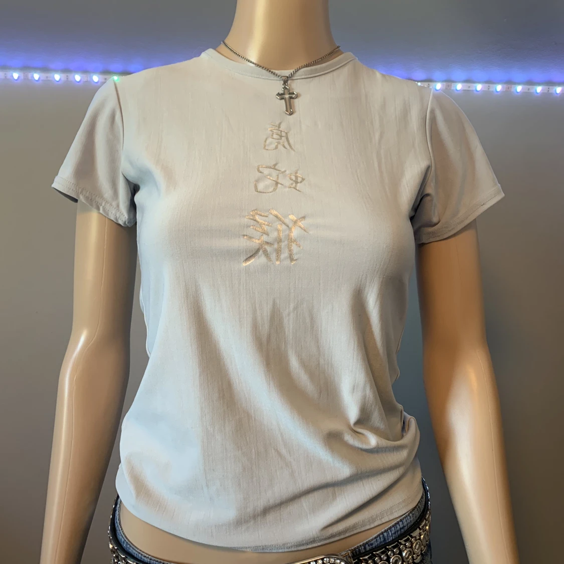 äkta y2k t-shirt med tryck, ljusblå-ish färg