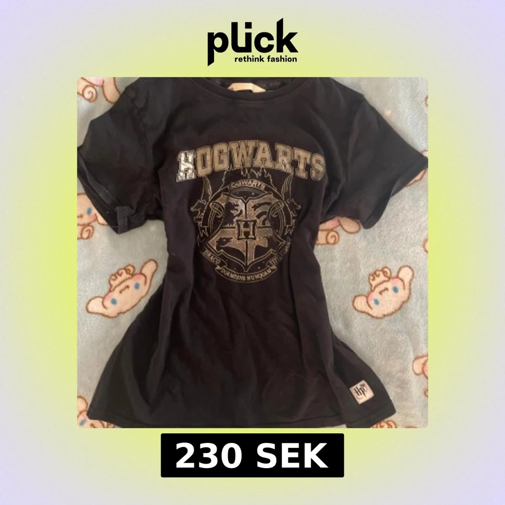Svart t-shirt med Hogwarts-tryck i silver och stort emblem på bröstet. Rund halsringning och korta ärmar. Märkt med officiell Harry Potter-logga och tillverkad i mjuk bomull. Snygg till att styla med jeans! För en 2000s outfit Passar storlek XS-S