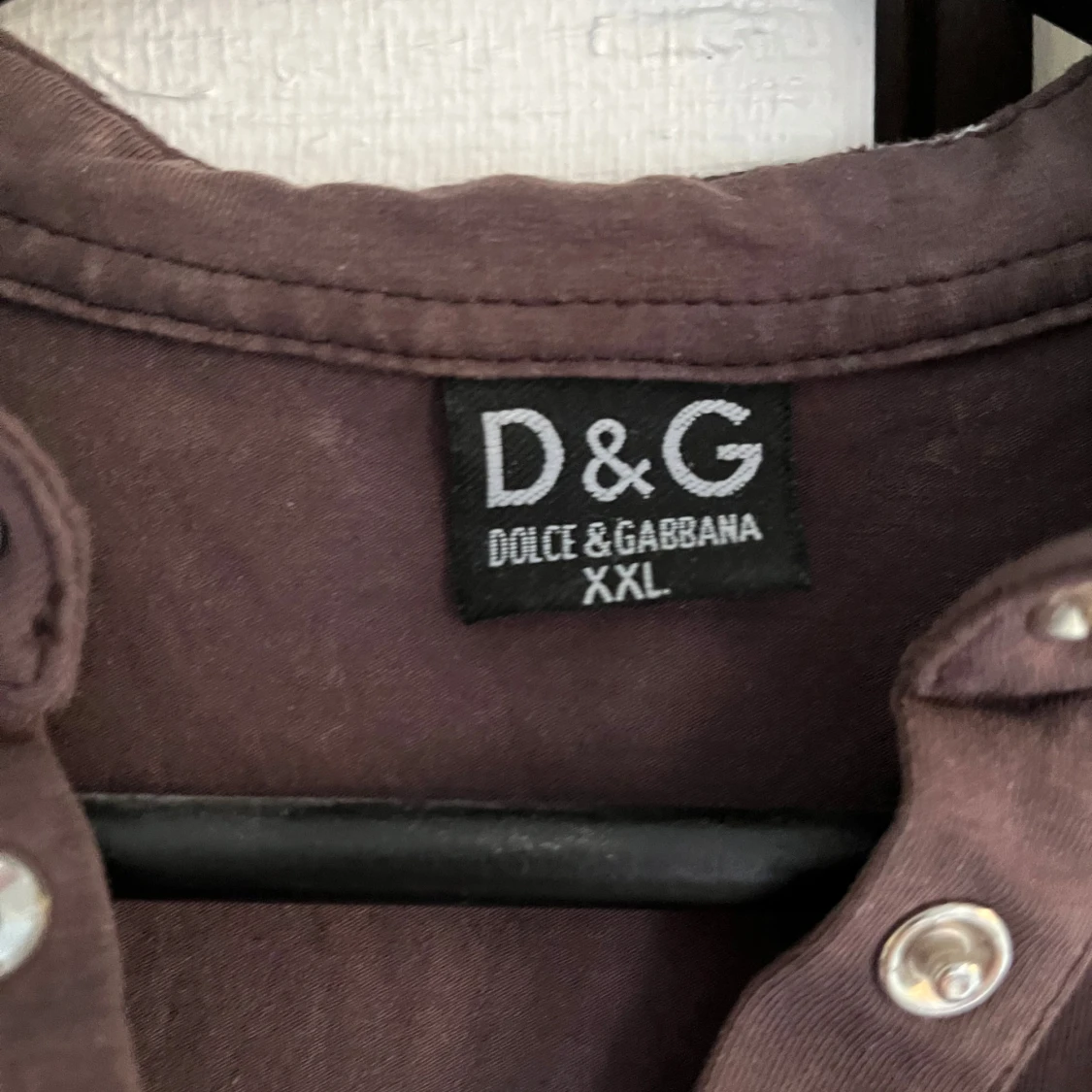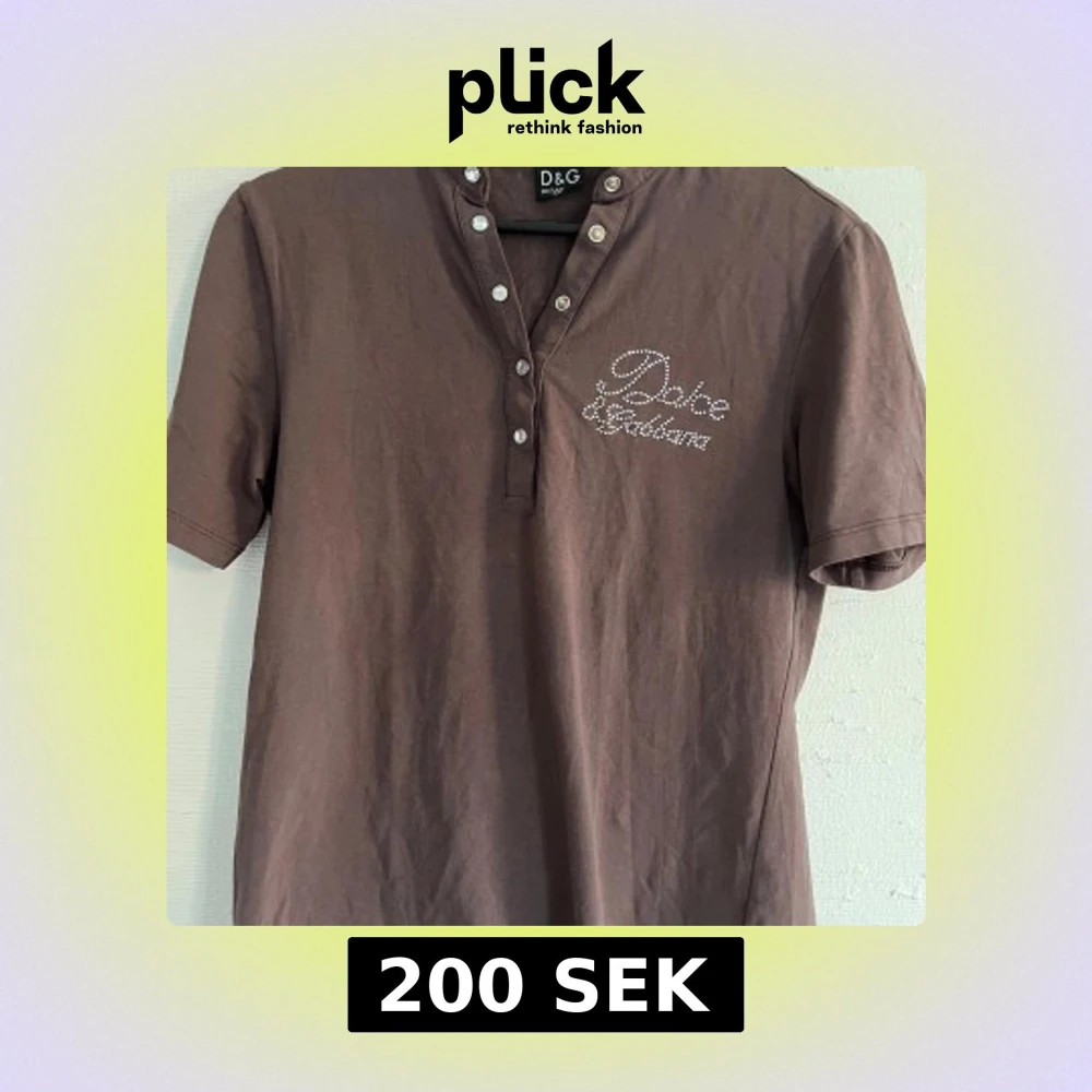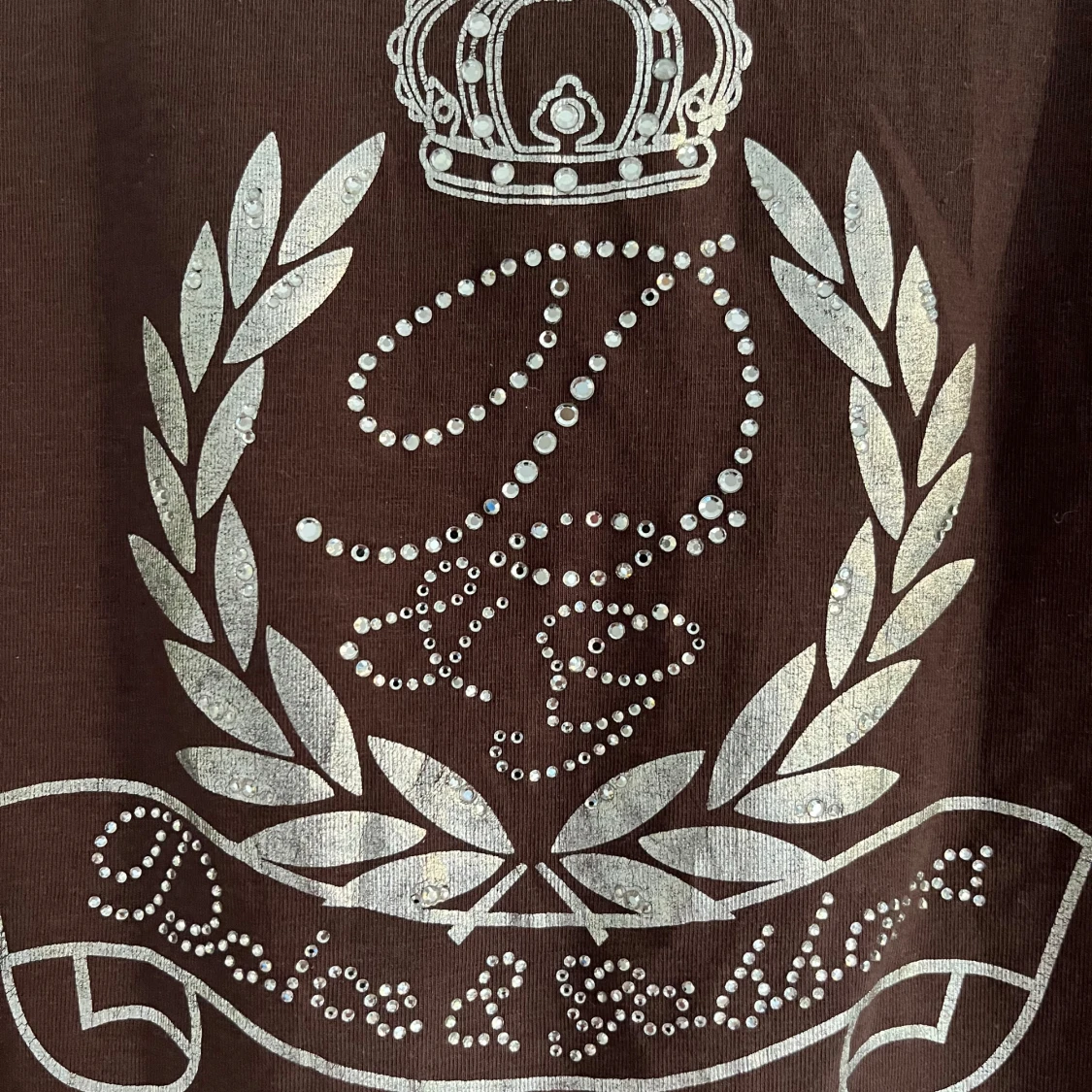 Brun t-shirt från Dolce & Gabbana med korta ärmar och dekorativa knappar vid halsen. Framsidan har logga i strass och baksidan har ett stort tryck med krona och logga i silver. Perfekt för dig som gillar statement-plagg.
