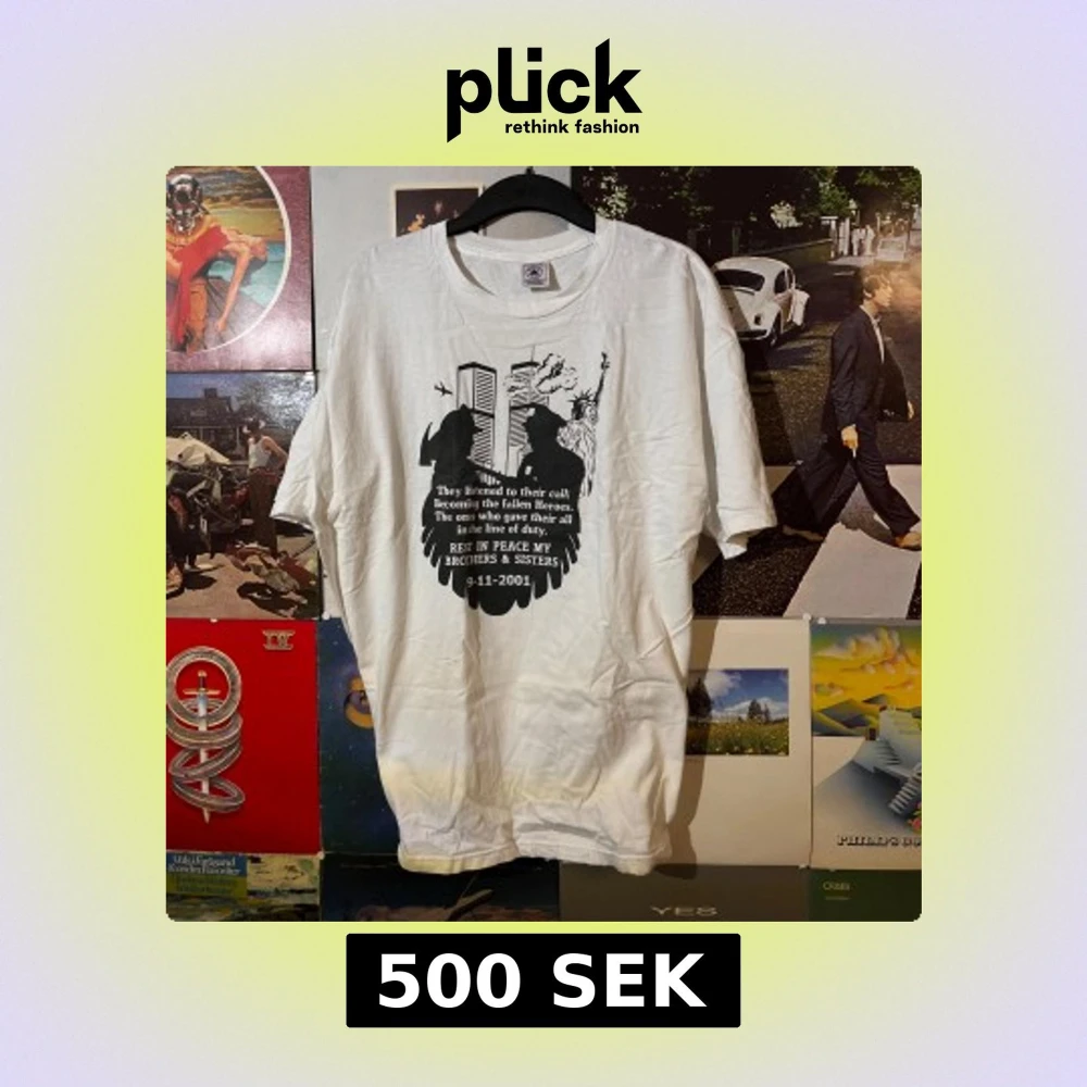Vit t-shirt från Delta med ett stort svart tryck på framsidan som hedrar hjältar från 9-11-2001. Trycket visar silhuetter av brandmän och Frihetsgudinnan framför Twin Towers. Texten lyder: 'They listened to their call; Becoming the fallen Heroes. The ones who gave their all in the line of duty. REST IN PEACE MY BROTHERS & SISTERS 9-11-2001.'